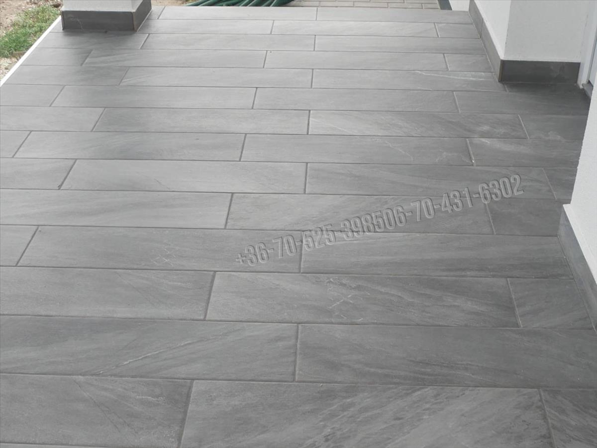 A kaputól a bejáratig, ill. a hátsó teraszig 1 m. Széles szürke viacolor járda.