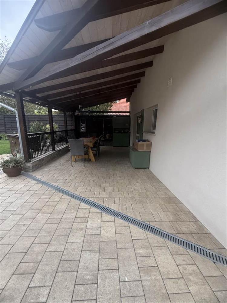 Az ingatlanhoz egy fedett terasz, tárolóhelyiség és garázs is tartozik.