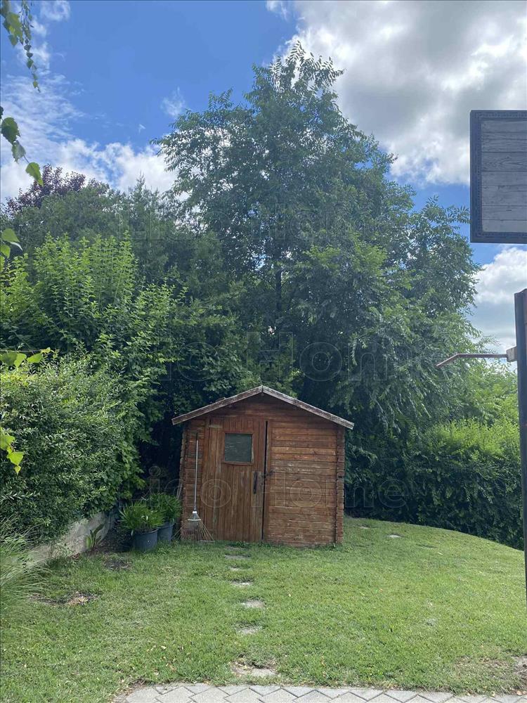 Az 1141 m2-es telek szépen parkosított, található itt kerti sütögető, grillező és szerszámtároló is.