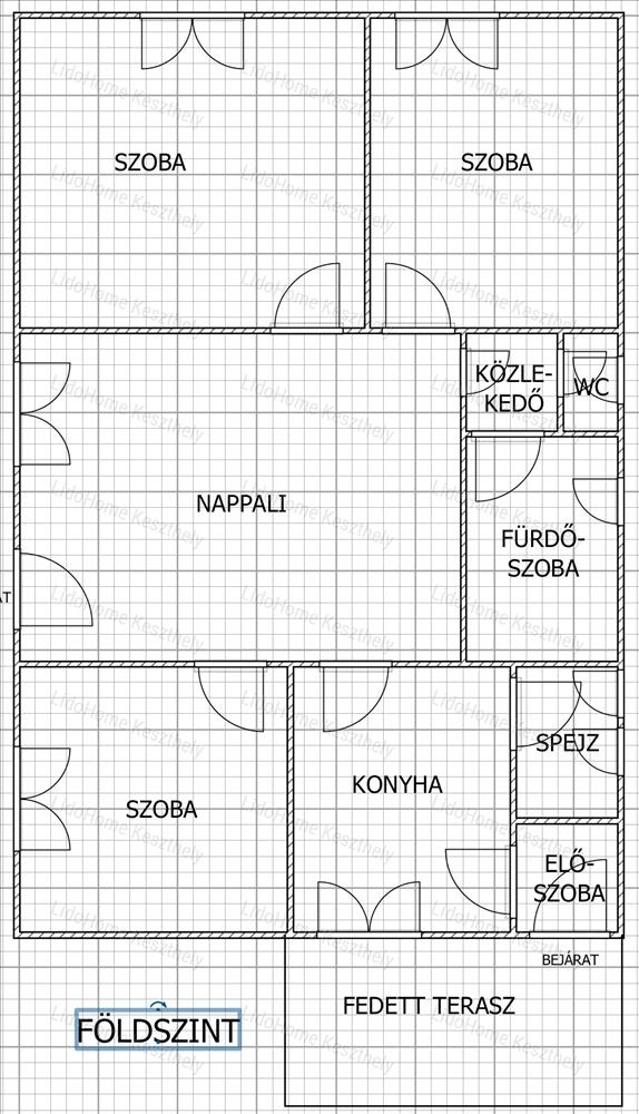 - Mindkét bejárata fedett teraszról nyílik, földszintjén előtér, nappali, 3 szoba, konyha, spejz, wc, fürdőszoba van, illetve a pincelejáró van.