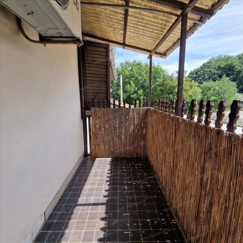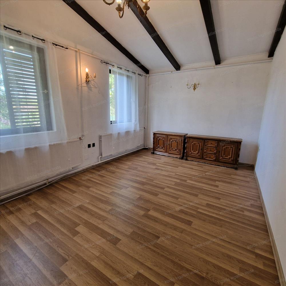 Szélfogóval védett külső lépcsőn jutunk az emeletre. Itt egy szinteltolásos konyha-étkező-nappali, 2 szoba, fürdőszoba, wc. , Közlekedő, és erkély szolgálja kényelmünket. Nyílászárói hőszigetelt fából készültek, zsalugáter árnyékolóval. Vizesblokkok hidegburkolattal, míg a szobák parkettával ellátottak. Fűtése gáz cirkó, radiátoros hőleadókkal.