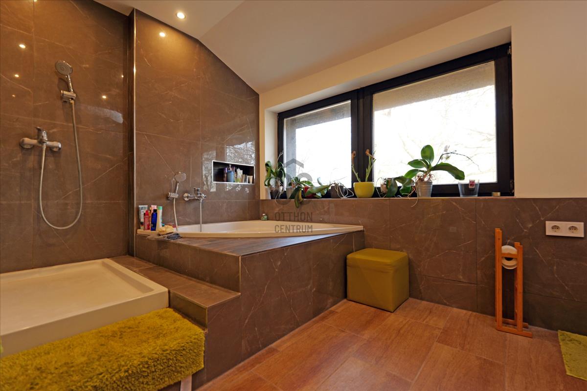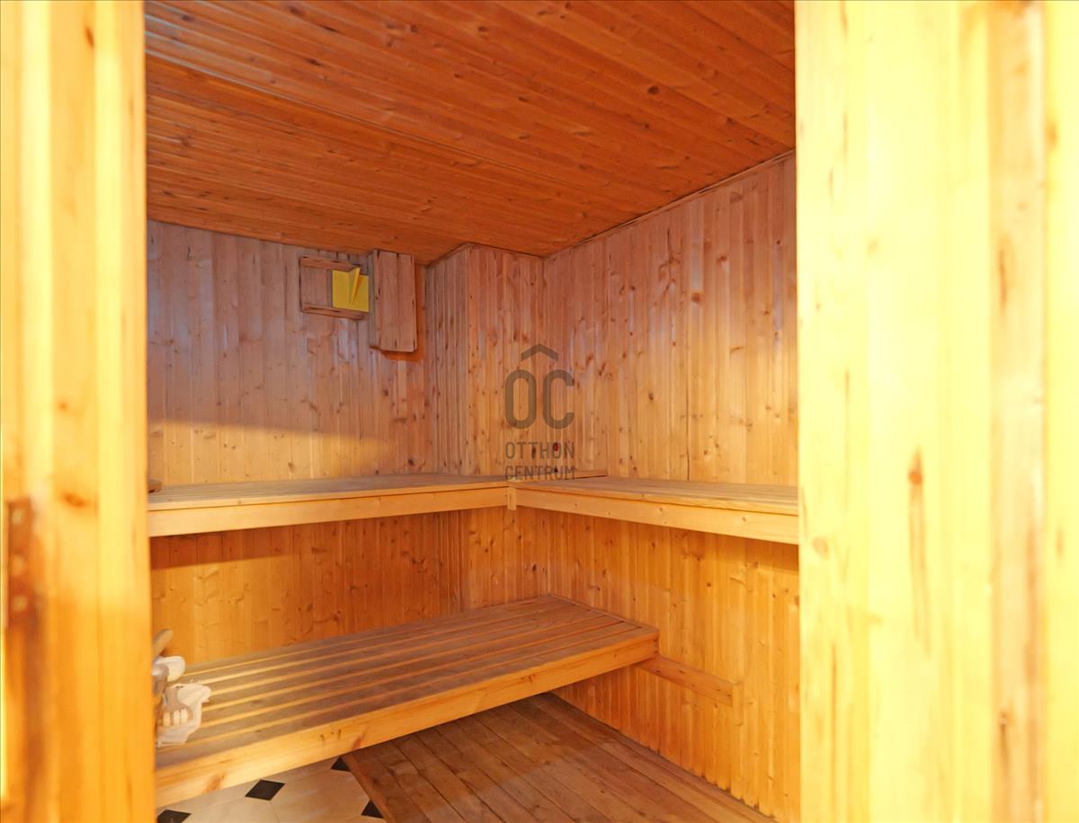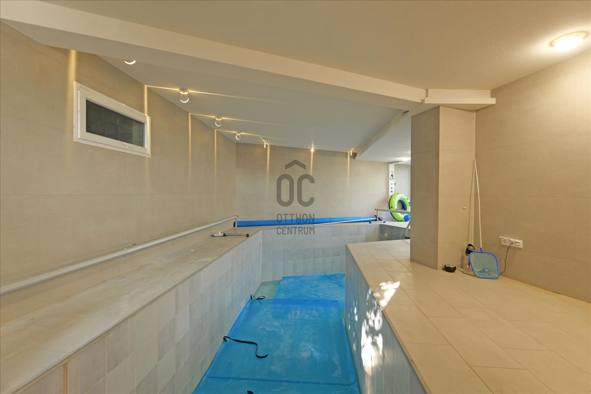 Az alsó szinten egy igazi különlegesség található: wellness részleg beltéri medencével, szaunával és jakuzzival. Ez a szint akár önálló lakrészként is kialakítható, így többgenerációs otthonként vagy vendégtérként is ideális.
