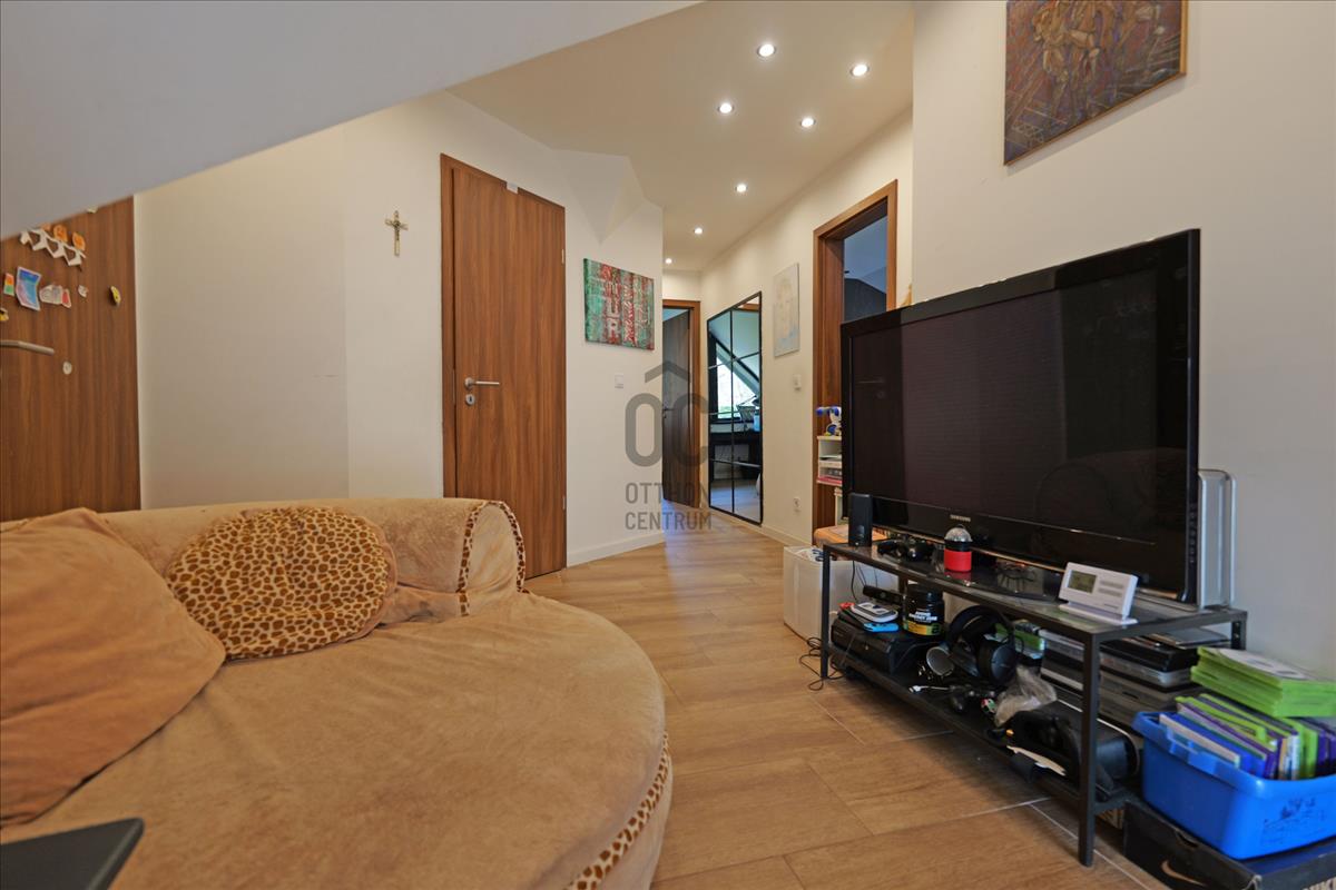 Az emeleten négy külön nyíló szoba és egy tágas fürdőszoba kapott helyet, így a család minden tagja számára biztosított a saját élettér.