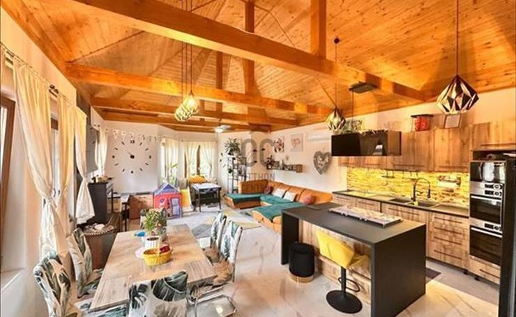 A teraszról a 12 m2-es előszobába lépünk be, amely nagyméretű, L alakú beépített szekrénnyel van felszerelve, továbbá itt található a gépészeti szekrény a kazánnal és a vízlágyítóval. a ház nyugati felét a konyhaszigetes amerikai konyha-étkező-nappali foglalja el. Ez a család életének valódi középpontja, mérete önmagában nagyobb, mint egy egész kétszobás lakás: 57 m2, és a térérzést megkétszerezi a nyitott fedélszék, burkolatával és szerkezetével egyaránt a fa természetes színét kiemelve. a nyugati oldalat trapéz alakú rizalit egészíti ki. Ez a nappali számára hangulatos sarkot biztosít, kiemeli a panorámás oldalat, és egyúttal a nyitott fedélszéket tagolja, organikus hatást és eleganciát kölcsönözve a térnek. a tágas fedélszék ünnepélyessége és a minimalista bútorzat fegyelmezett vonalai kiválóan egészítik ki egymást. a konyhabútor egységesen Bosch gépekkel lett felszerelve: a konyhaszigeten öt zónás főzőlappal, páraelszívóval, a sarokrészen két sütővel, mikrohullámú sütővel és mosogatógéppel. a konyhaszekrények a sütők két oldalán, L alakban bőséges tárolási lehetőséget biztosítanak, amelyet 4 m2 külön spejz helyiség is kiegészít. a hat személyes étkezőbútor a déli ablakok előtt kapott helyet.