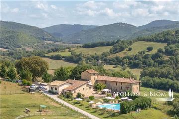 19. századi birtok: kőfarmház, vendégház, úszómedence, földterület olajfaligettel, 6 standos istállóval, eladó Perugiában.
