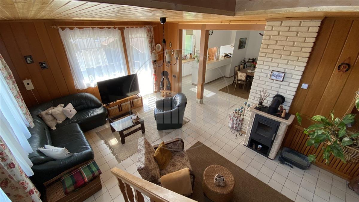 80 m2 alapterületű, központi része a D-Ny tájolású, teraszkapcsolatos nappali. Különleges és otthonos hangulatot áraszt magából a faanyagok dominanciájának és a cserép kandallónak köszönhetően. a nagyméretű műanyag ablakok természetes fénnyel látják el a helyiséget. a konyha és az étkező csak optikailag különül el a nappalitól, egyébként egy légtérben található a három helyiség. a magasföldszint egyetlen hálószobája egy kellemes, méretében is optimális helyiség. Klimatizált, szintén világos és egy nagy egyedileg készített gardróbszekrényt is tartalmaz. a jól kihasználható konyhához tartozik egy tágas kamra. Az előszobából megközelíthető a 15 m2 alapterületű garázs és az alagsori helyiségek is. a földszinten kialakított fürdőszoba és wc, elkülönülnek egymástól.