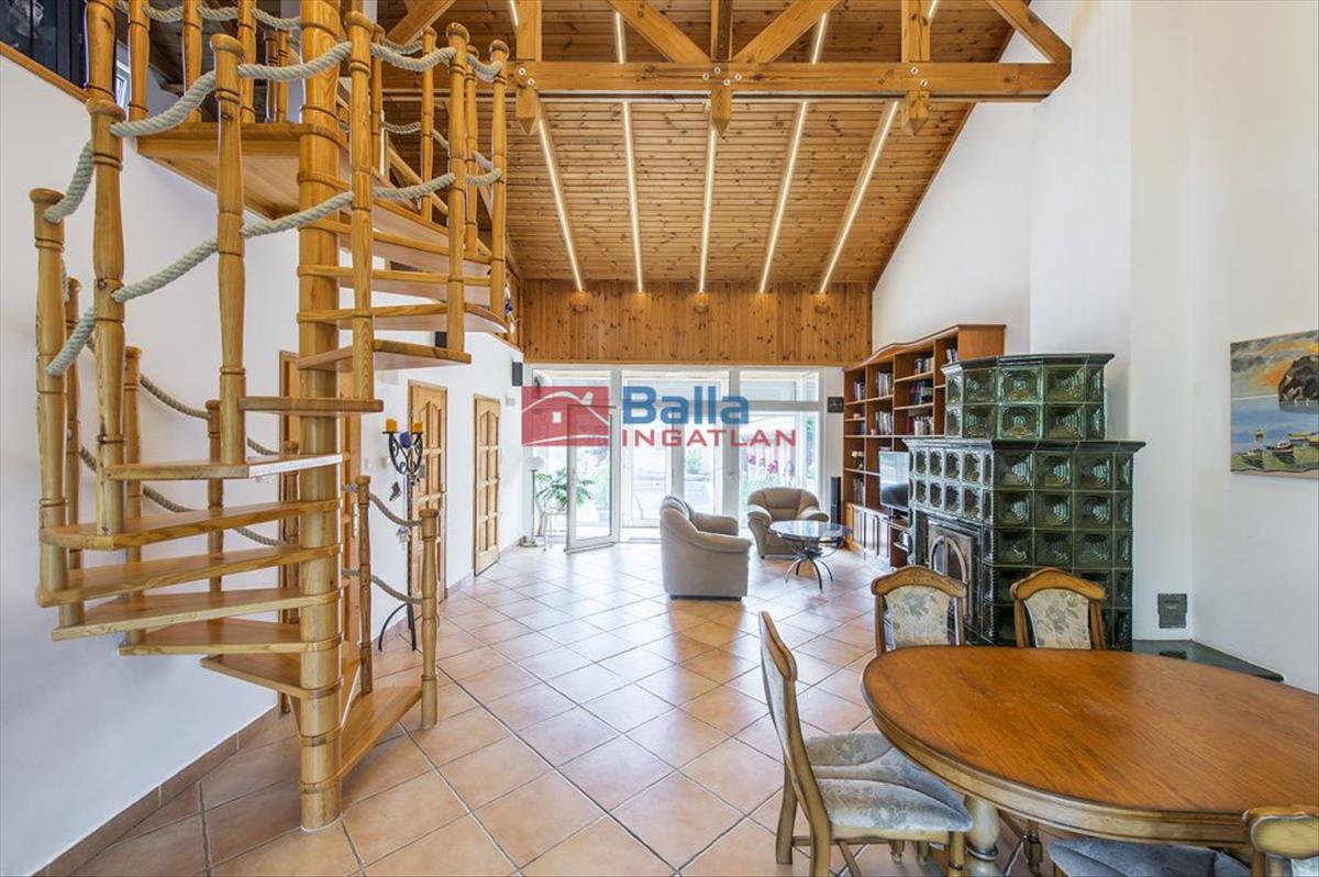 A főépület 100 m²-es, hatalmas panorámaablakokkal, 5, 6 méteres belmagassággal. Galériás nappali cserépkályhával, hálószoba, fürdőszoba, külön Wc, modern konyha. Fűtése kombi cirkóval és padlófűtéssel megoldott.