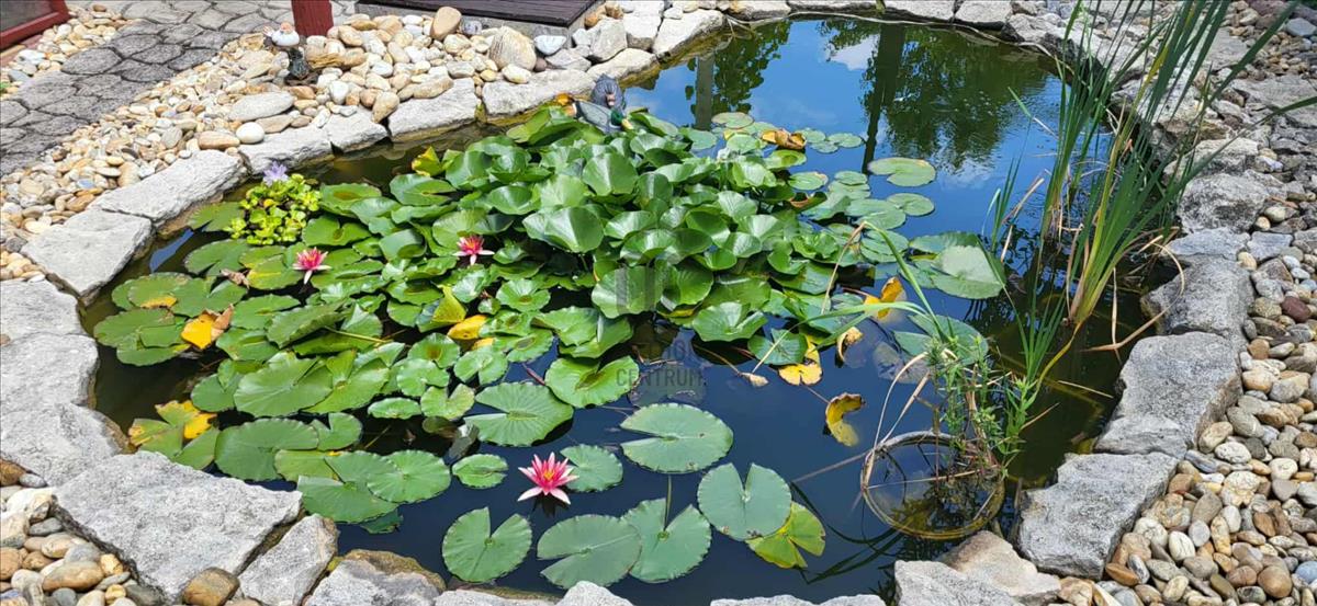 • fóliasátor, medencének kialakított terület és kis kerti tó