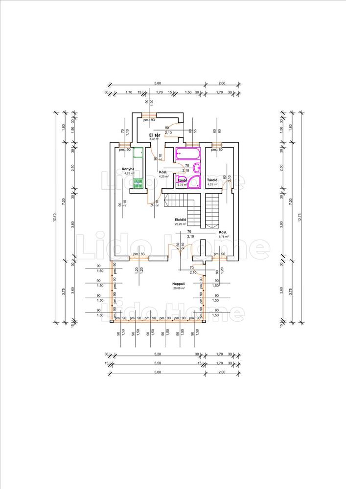 -Földszint: előtér, közlekedő, fürdőszoba (kád, zuhanyzó, mosdó, wc), konyha, nappali, tároló