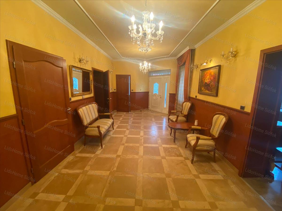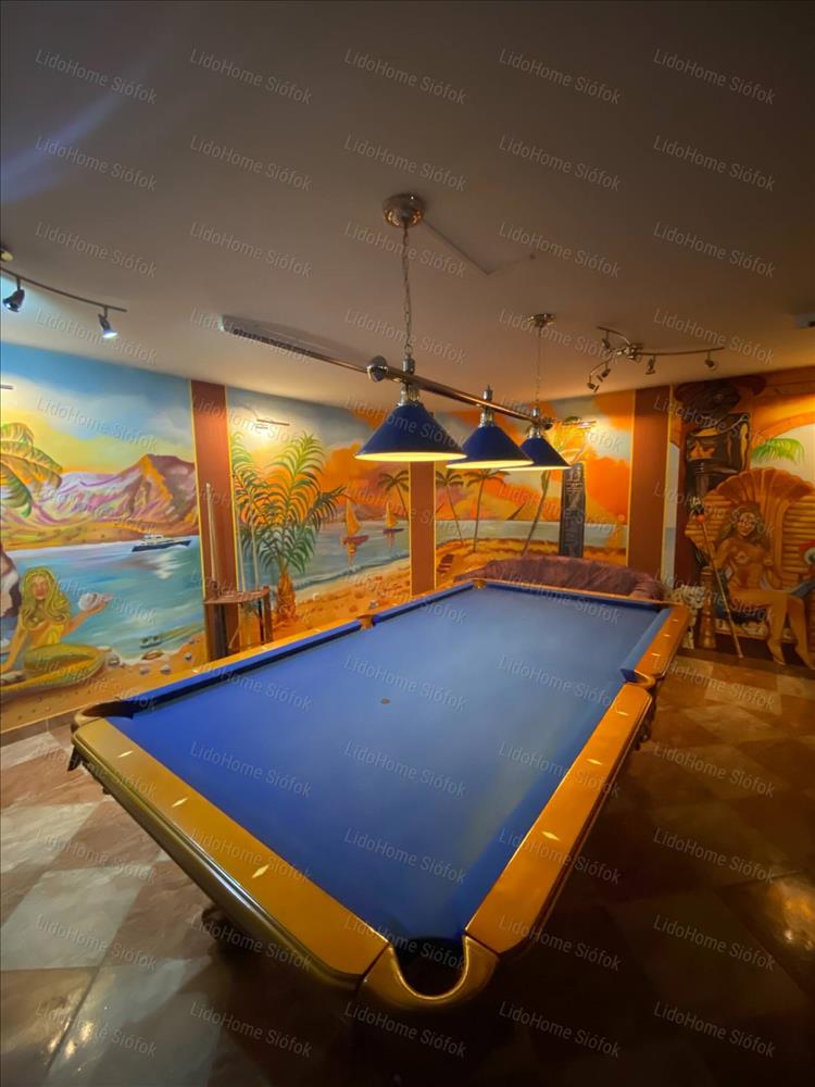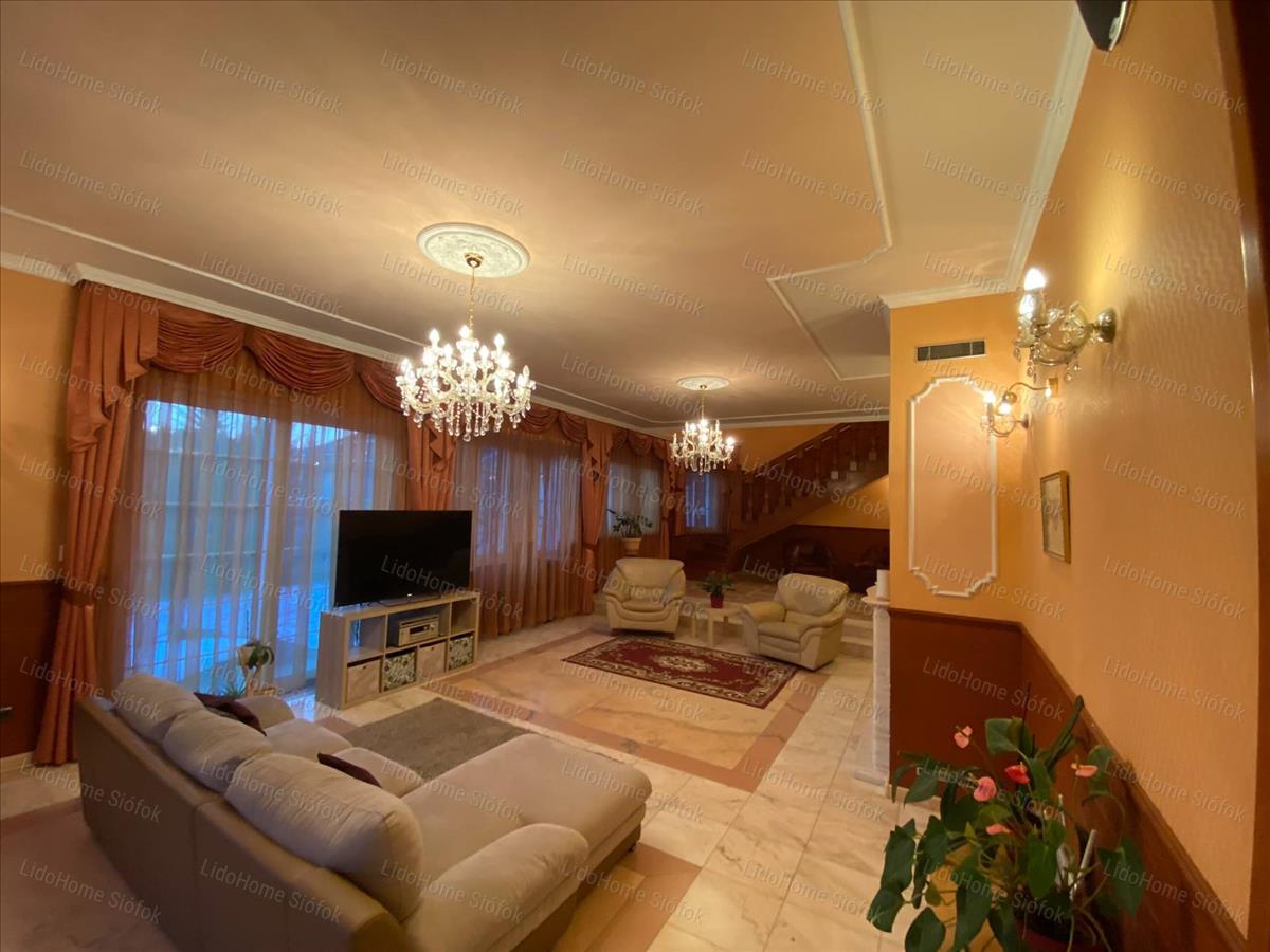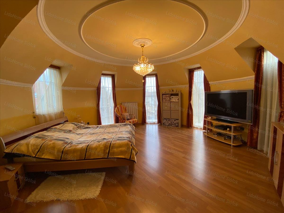 Exkluzív ingatlan, exkluzív vevőnek! Siófok legkedveltebb kertvárosi részén, a Foki-hegyen eladó 3 szintes nettó 1000 m2 lakóterületű családi ház. Az emeleten 6 lakosztály (saját fürdőszobával és gardróbszobával) 1 szoba, 1 félszoba, előtér folyosóval és erkély található. Földszinten tágas előszoba, dolgozószoba, mosdó wc-vel, gardróbszoba, nagy konyha különálló étkezővel és hatalmas nappali lett kiépítve. Szinteltolással a földszinten található egy 4 kocsibeállós fűthető garázs tárolóval, valamint beltéri medence szaunával és jacuzzi-val, illetve egy fürdőszoba. Az alagsorban konditerem, mosókonyha, kamra, gépház, 1 szoba és játékterem billiárdasztallal, uv falfestménnyel, mosdó wc-vel került kialakításra. Fél szinttel lejjebb található a medence gépház, mellette 2 tároló helyiséggel. Innen nyílik egy befejezésre váró helyiség, ami moziteremnek volt tervezve.