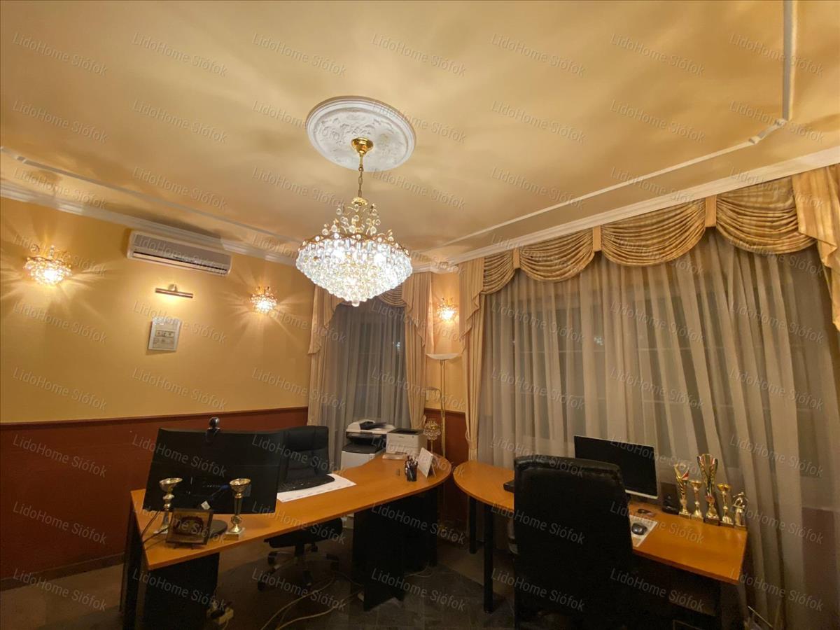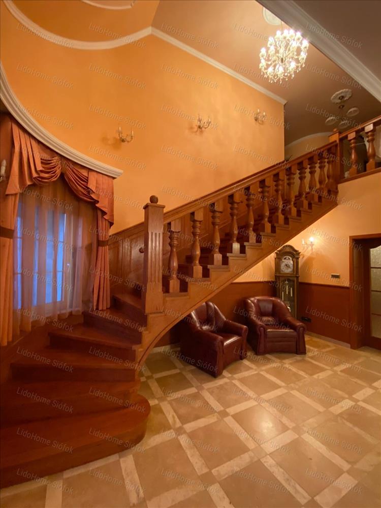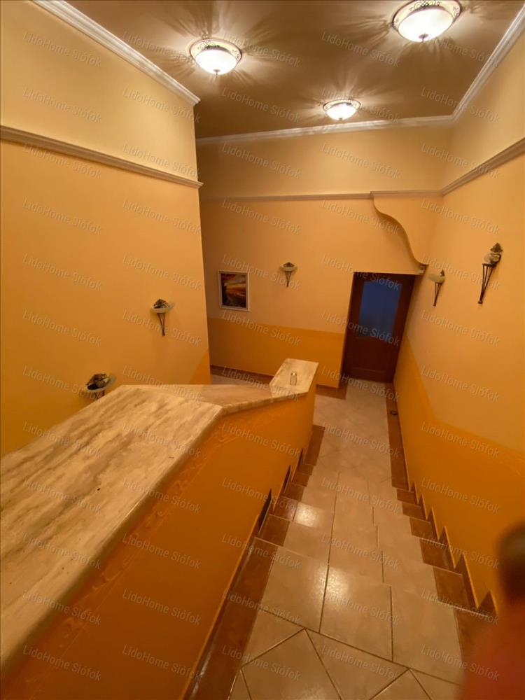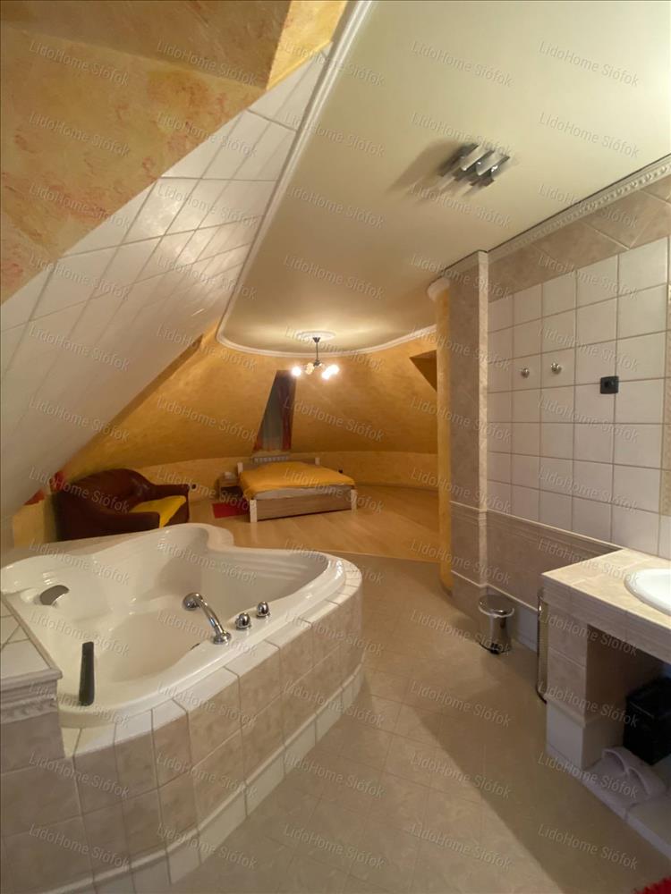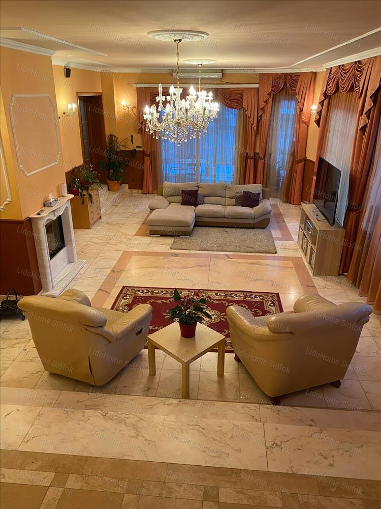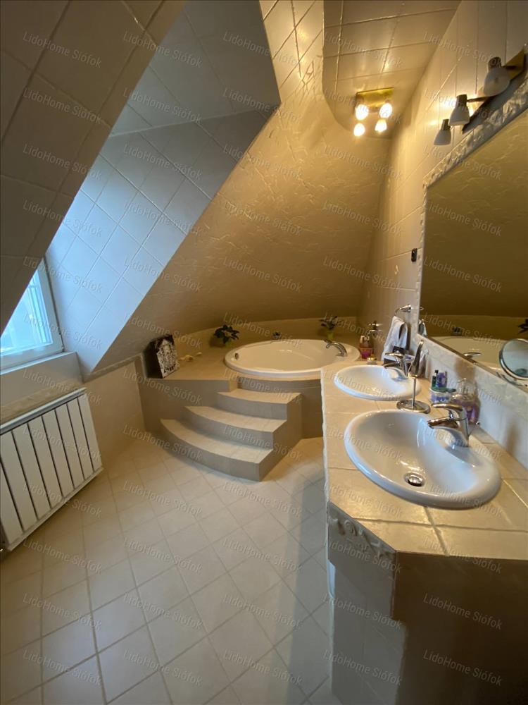 Exkluzív ingatlan, exkluzív vevőnek! Siófok legkedveltebb kertvárosi részén, a Foki-hegyen eladó 3 szintes nettó 1000 m2 lakóterületű családi ház. Az emeleten 6 lakosztály (saját fürdőszobával és gardróbszobával) 1 szoba, 1 félszoba, előtér folyosóval és erkély található. Földszinten tágas előszoba, dolgozószoba, mosdó wc-vel, gardróbszoba, nagy konyha különálló étkezővel és hatalmas nappali lett kiépítve. Szinteltolással a földszinten található egy 4 kocsibeállós fűthető garázs tárolóval, valamint beltéri medence szaunával és jacuzzi-val, illetve egy fürdőszoba. Az alagsorban konditerem, mosókonyha, kamra, gépház, 1 szoba és játékterem billiárdasztallal, uv falfestménnyel, mosdó wc-vel került kialakításra. Fél szinttel lejjebb található a medence gépház, mellette 2 tároló helyiséggel. Innen nyílik egy befejezésre váró helyiség, ami moziteremnek volt tervezve.