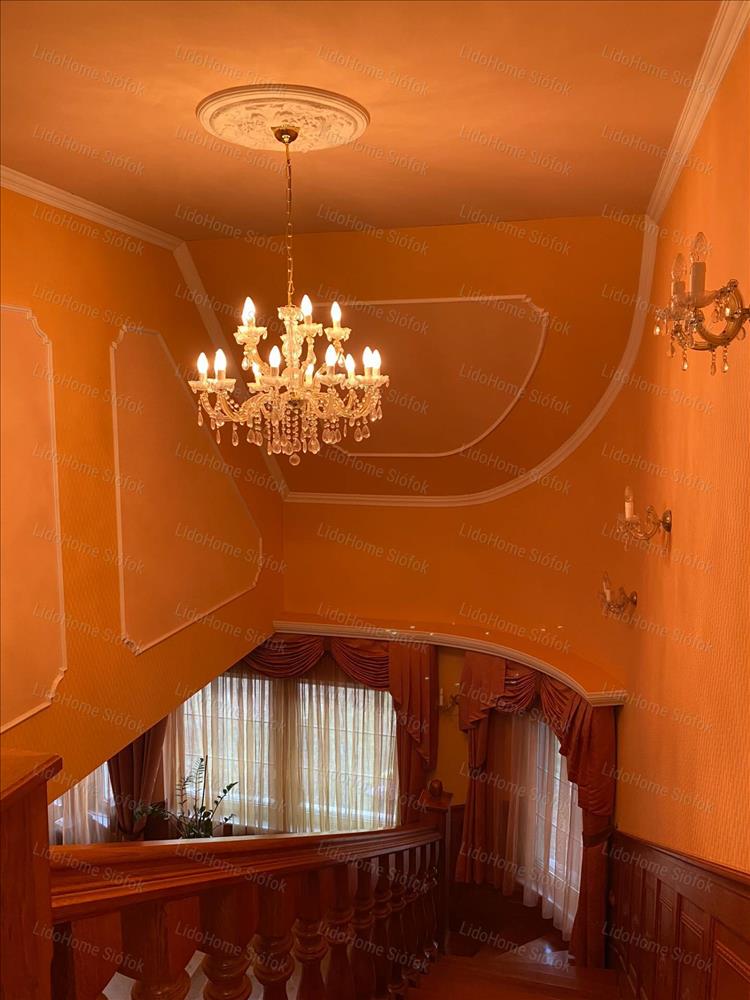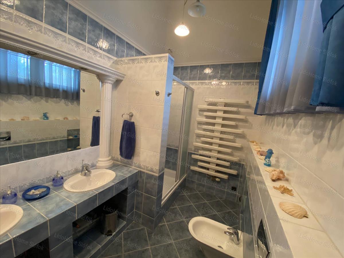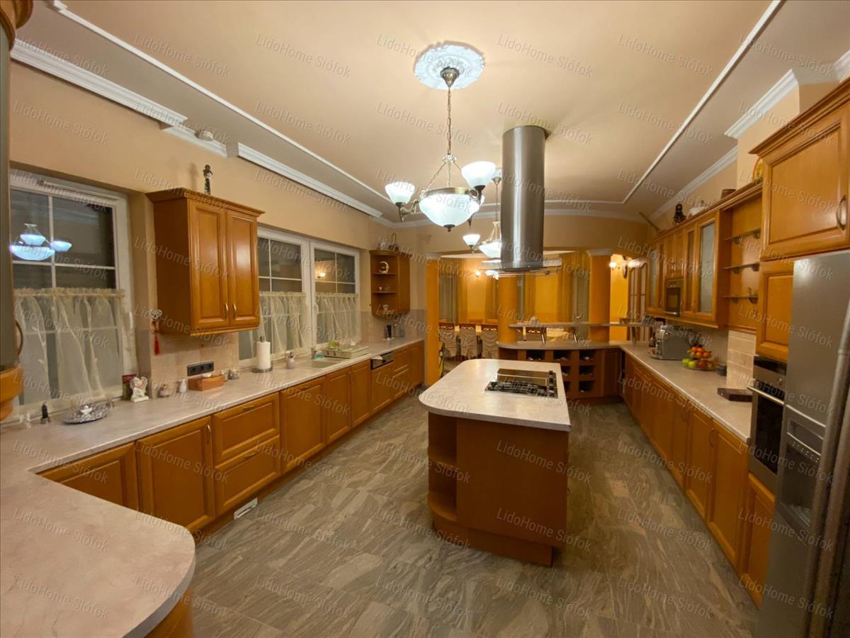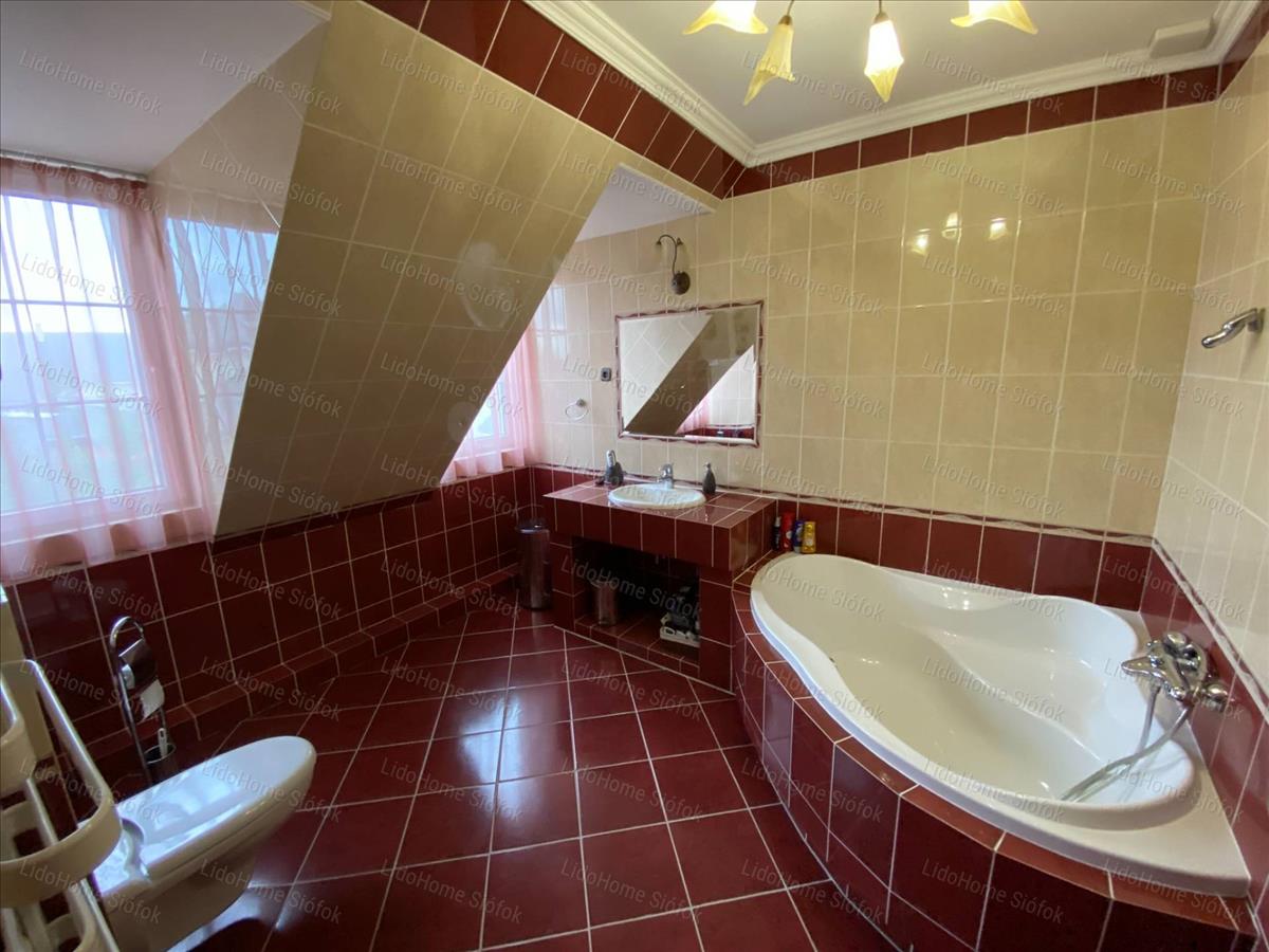 Exkluzív ingatlan, exkluzív vevőnek! Siófok legkedveltebb kertvárosi részén, a Foki-hegyen eladó 3 szintes nettó 1000 m2 lakóterületű családi ház. Az emeleten 6 lakosztály (saját fürdőszobával és gardróbszobával) 1 szoba, 1 félszoba, előtér folyosóval és erkély található. Földszinten tágas előszoba, dolgozószoba, mosdó wc-vel, gardróbszoba, nagy konyha különálló étkezővel és hatalmas nappali lett kiépítve. Szinteltolással a földszinten található egy 4 kocsibeállós fűthető garázs tárolóval, valamint beltéri medence szaunával és jacuzzi-val, illetve egy fürdőszoba. Az alagsorban konditerem, mosókonyha, kamra, gépház, 1 szoba és játékterem billiárdasztallal, uv falfestménnyel, mosdó wc-vel került kialakításra. Fél szinttel lejjebb található a medence gépház, mellette 2 tároló helyiséggel. Innen nyílik egy befejezésre váró helyiség, ami moziteremnek volt tervezve.