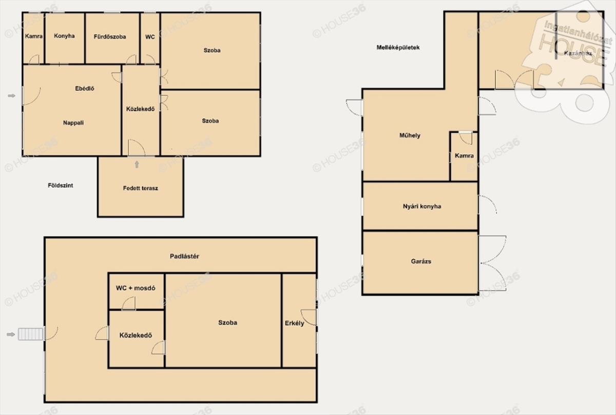 kb. 60 m2, több helyiségből (garázs, nyári konyha, műhely, tűzifatároló) álló melléképület, állattartó egységek;