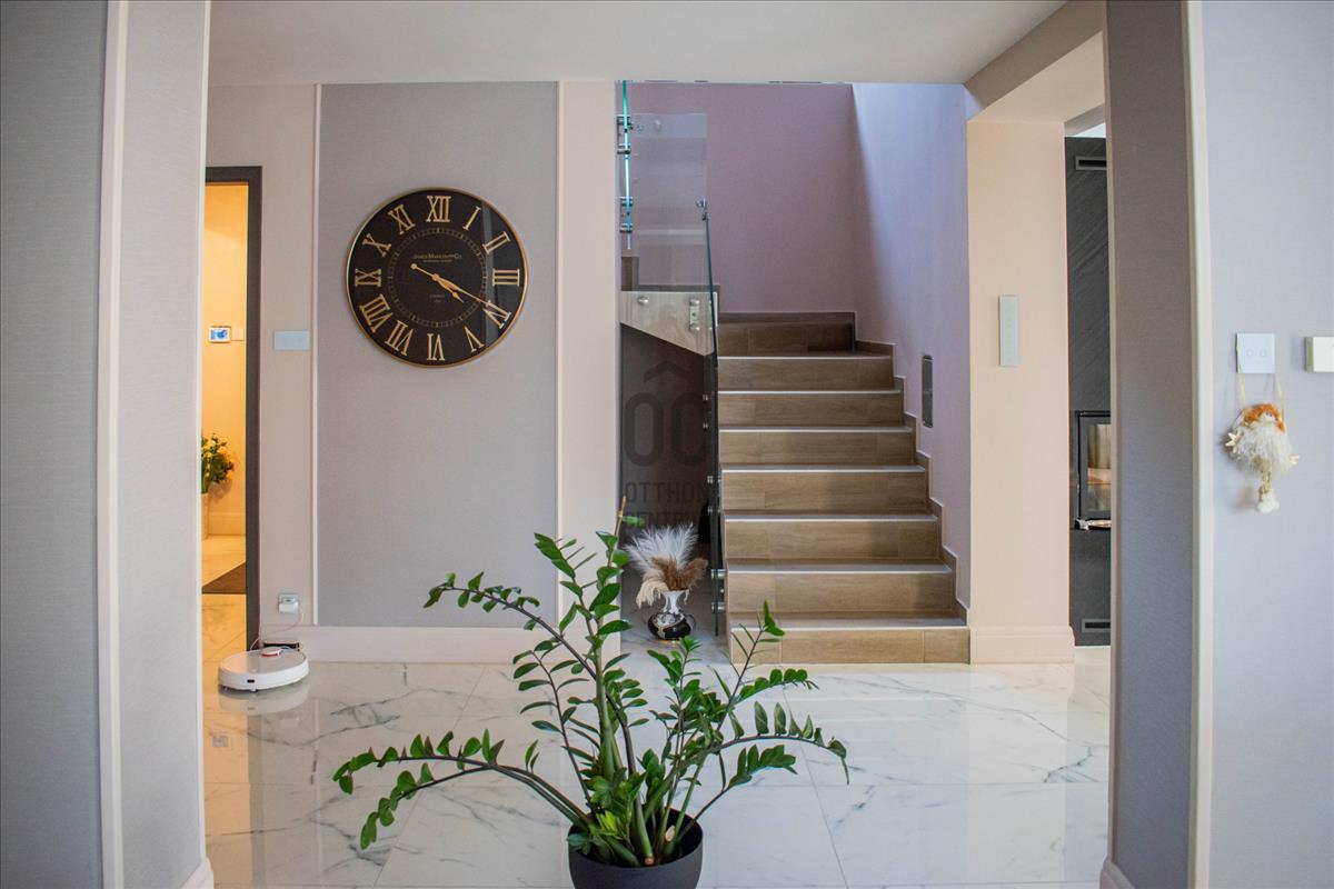 Tágas előszoba és közlekedő, 2 modern kialakítású fürdőszoba, 4 szoba (24, 4 m2, 14 m2, 12, 6 m2, 9m2, melyből egy jelenleg gardróbként funkcionál), háztartási helyiség és gépészeti helyiség biztosítja a mindennapok kényelmét.
