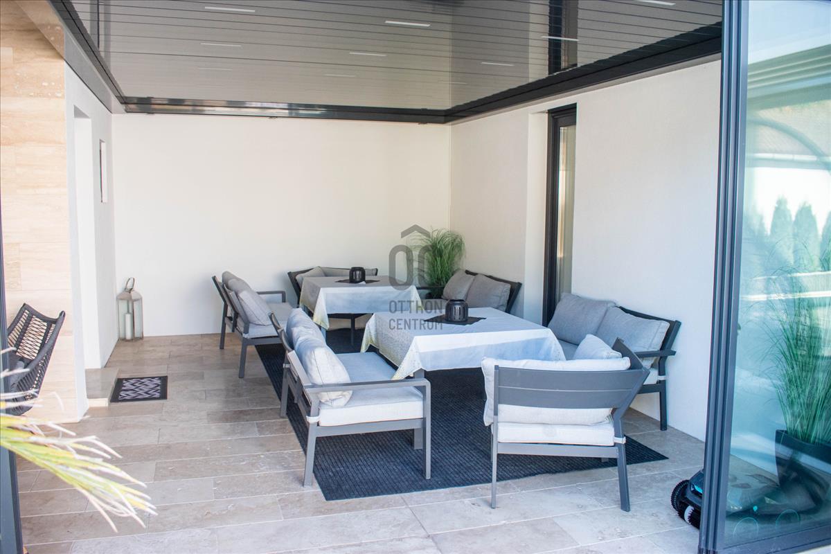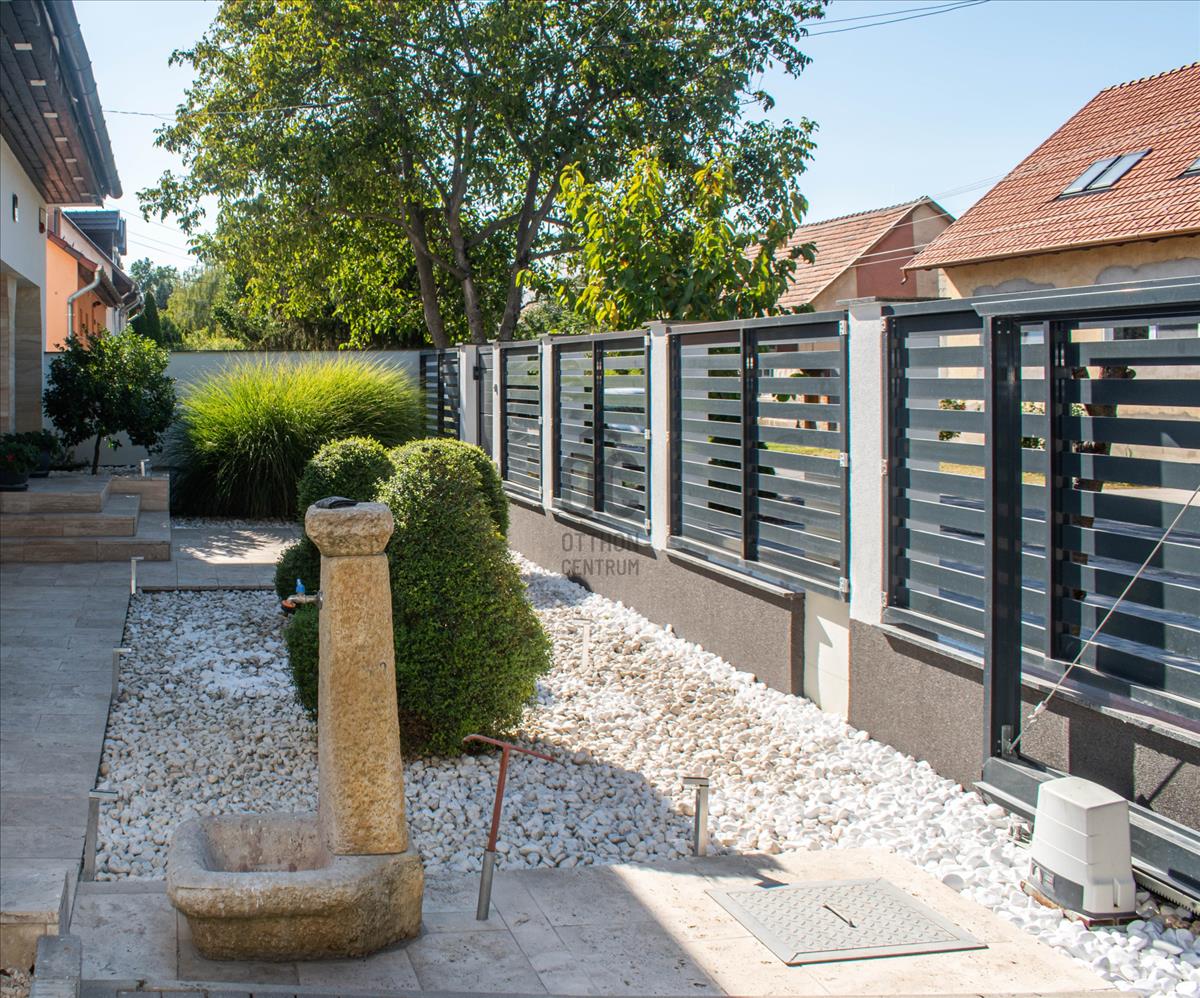 A gondozott, átgondolt, harmonikus kert és a fűthető, fedett, ellenáramoltatóval felszerelt medence garantálja a teljes kikapcsolódást a fárasztó hétköznapokat követően.