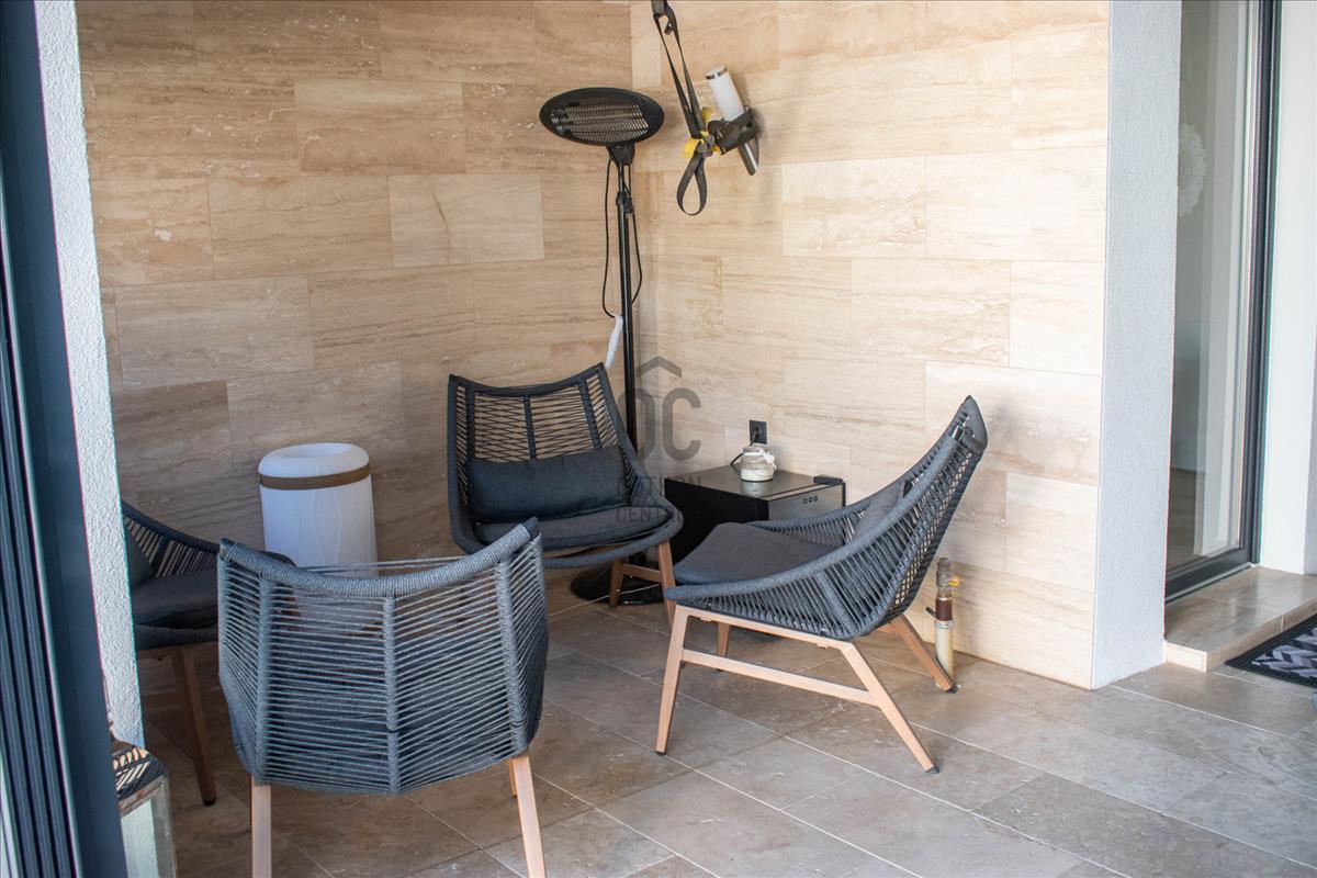 A nappaliból közvetlen kapcsolat vezet a 26 m²-es, bioklimatikus pergolás teraszra, amely egész évben használható élettér – tökéletes helyszín étkezésekhez, pihenéshez vagy vendégfogadáshoz.
