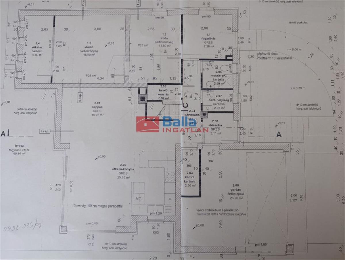 f)műszaki paraméterek: 7m mély vasbeton cölöpös alapozás vasbeton fejgerendákkal összefogva; bitumenes vastaglemez vízszigetelés 6cm lépésálló polisztirol (Eps) hőszigeteléssel, a lábazat is szigetelve lett; 30cm Porotherm tégla főfalak 8cm polisztirol hőszigeteléssel és 10cm tégla válaszfalak; födém a két emelet között: Porotherm vázkerámiabetétes gerendák 4cm betonozással, valamint a lépcsőknél vasbeton gerendák; Fenyőfa nyeregtető; Tondach égetett cserép héjazat; Wavin vízcsövek és padlófűtés csövek