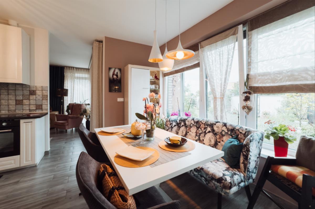A tágas nappaliból egy hangulatos, fedett teraszra juthatunk ki, amely közvetlen kapcsolatban áll a kerttel – ideális helyszín a pihenésre vagy baráti összejövetelekre.