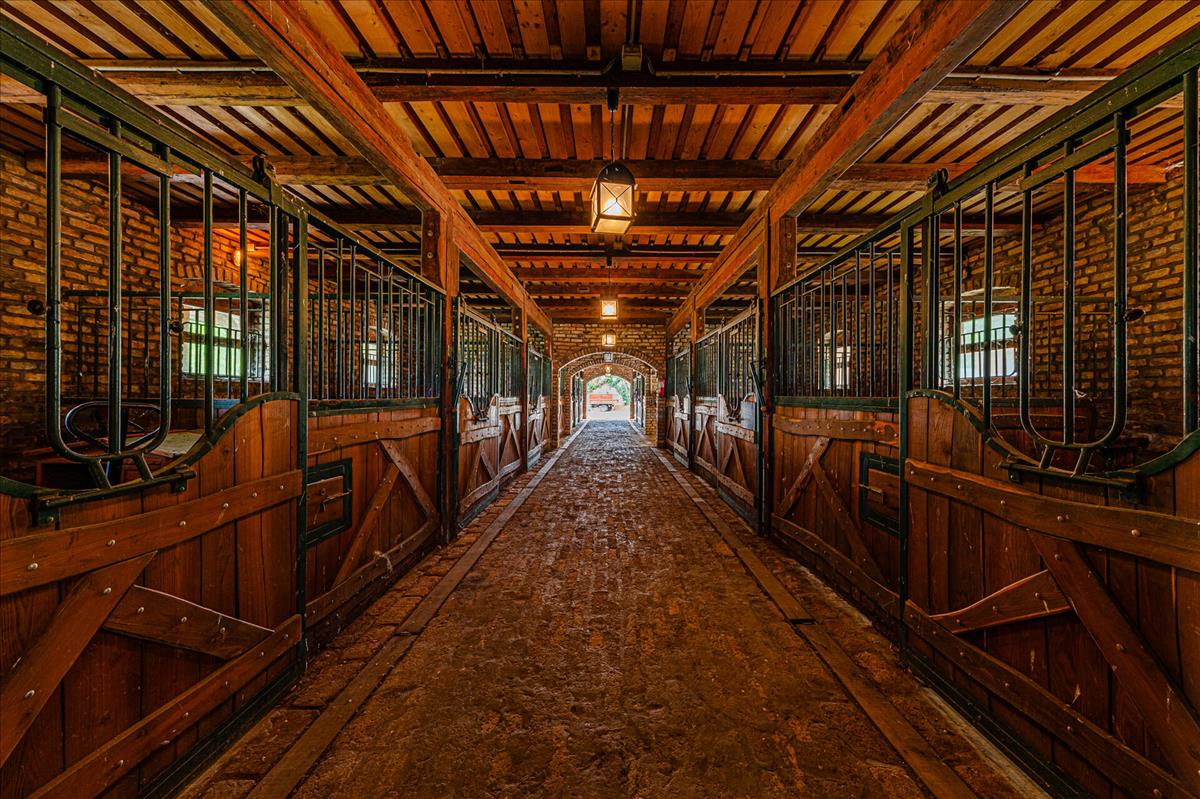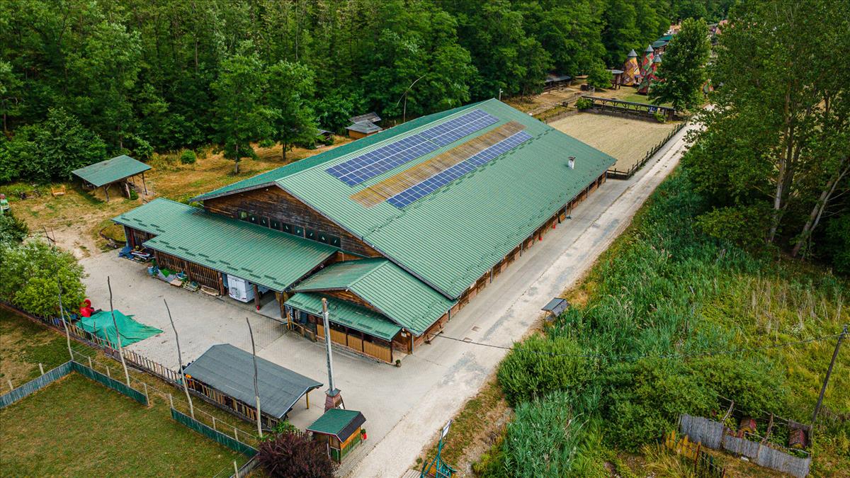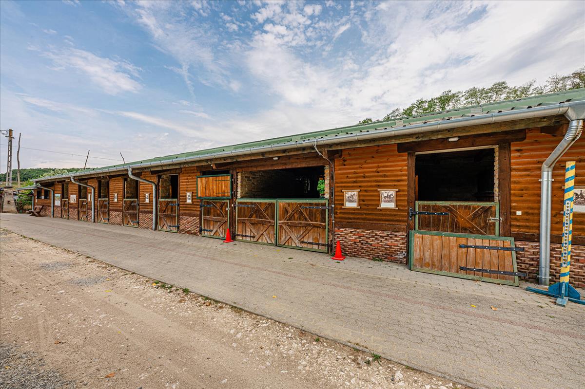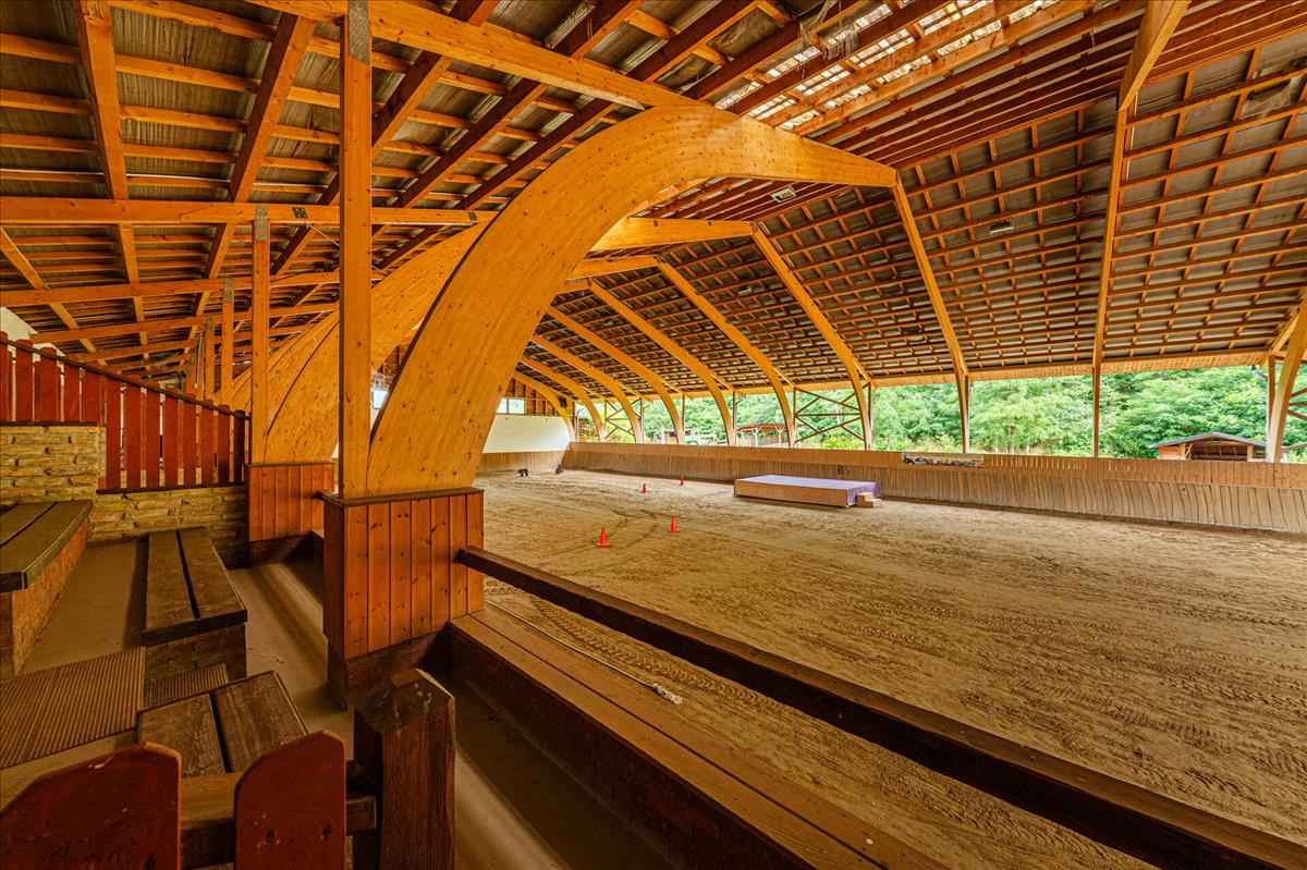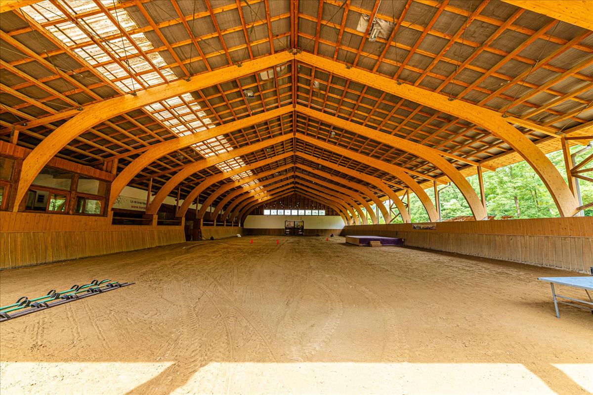 Fedett lovarda, 250 fő befogadására alkalmas, 13 box, nemzetközi szabványú edző- és versenypályával