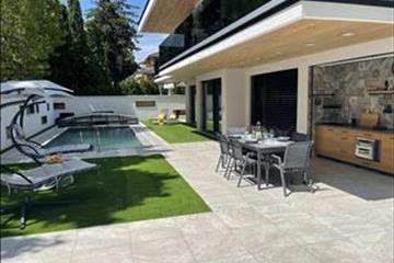 A kertben egy 34 m2-es fűthető úszómedence is helyet kapott, mellette pedig egy nyárikonyha is kialakításra került. Az udvarban parkolási lehetőség van több autó számára is. Az telek műfűvel borított és jelenleg is folyamatos karbantartás alatt áll.