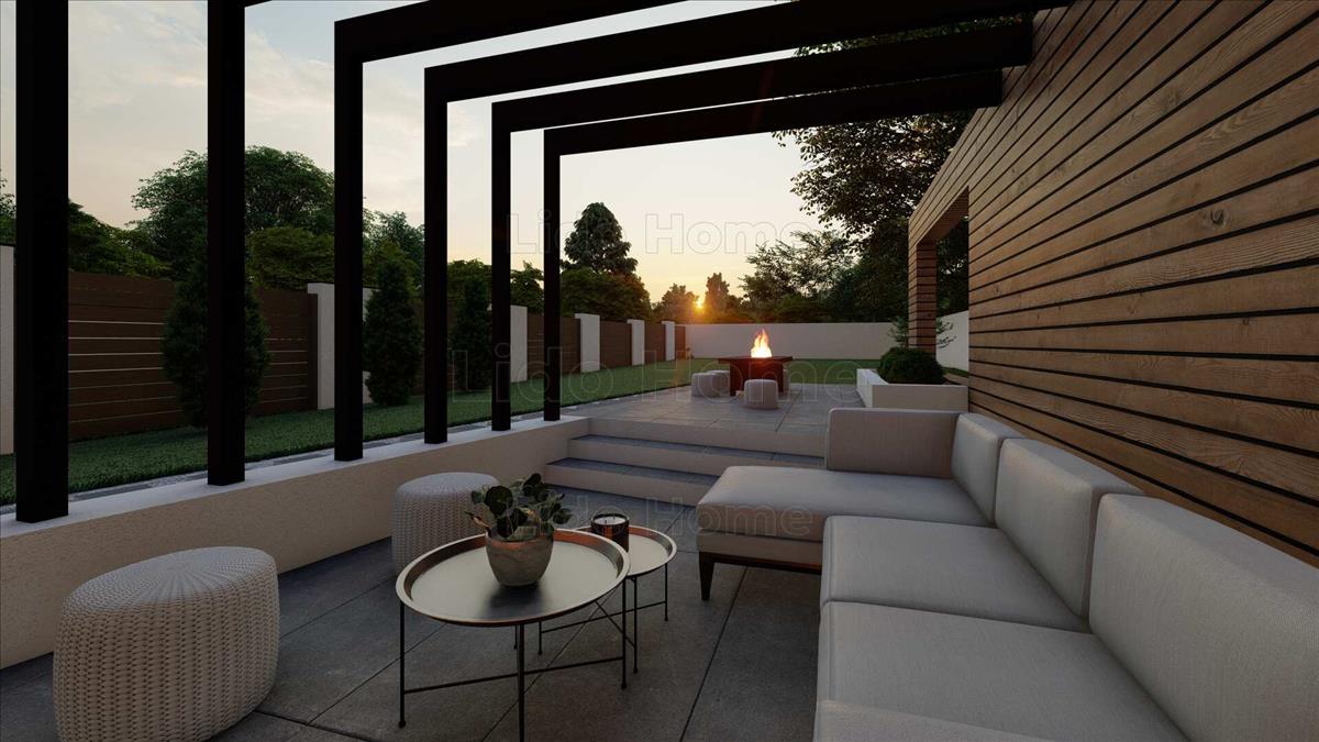 -A földszinten egy világos, tágas amerikai konyhás nappali került kialakításra, amely közvetlenül kapcsolódik a részben pergolával fedett, nagy méretű teraszhoz. Egy ízlésesen kialakított fürdőszoba kapott még helyet a földszinten.