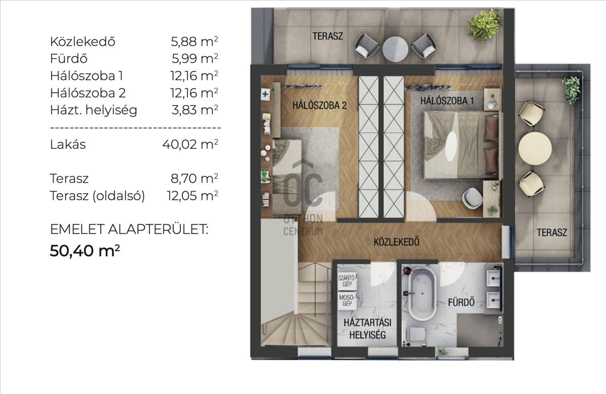 Teraszok: 3 db (összesen több mint 40 m²)
