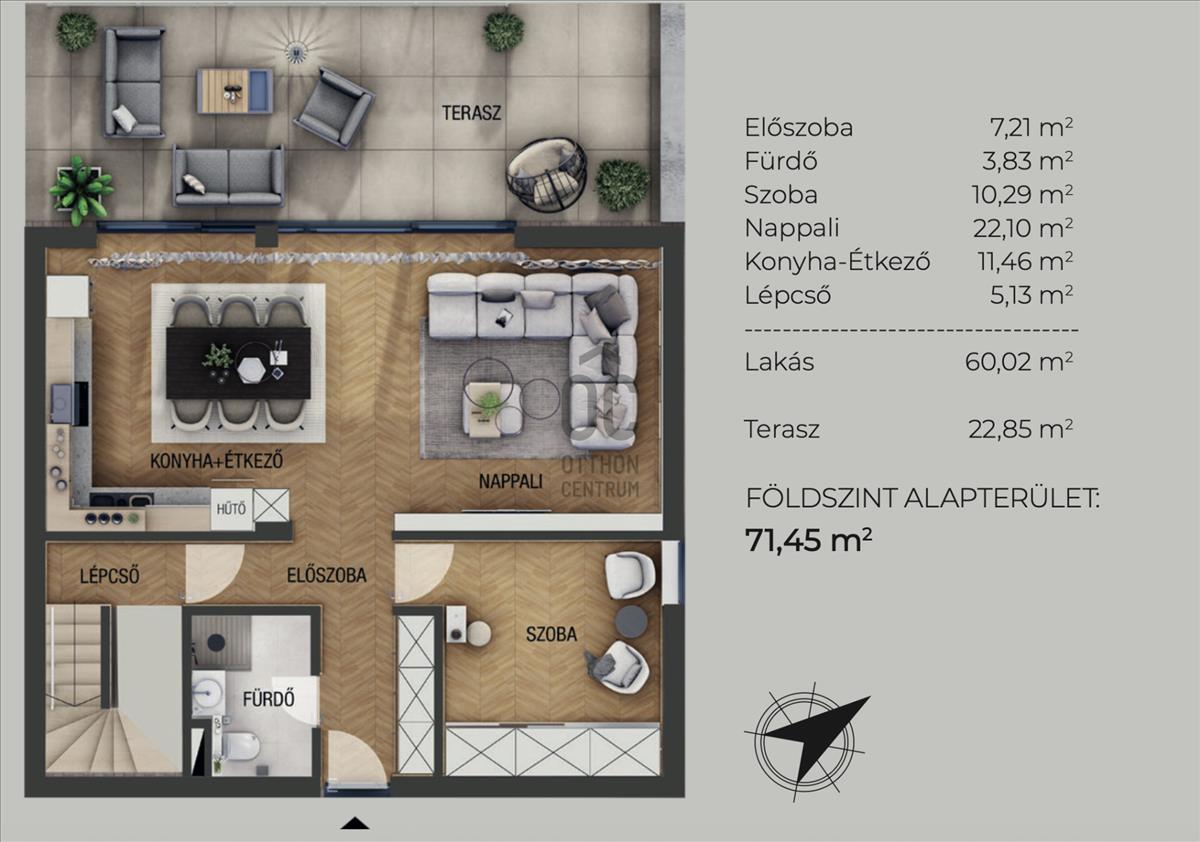 Alapterület: 100 m² ( bruttó 121, 85 m² ) (Földszint: 71, 45 m² + Emelet: 50, 40 m²)