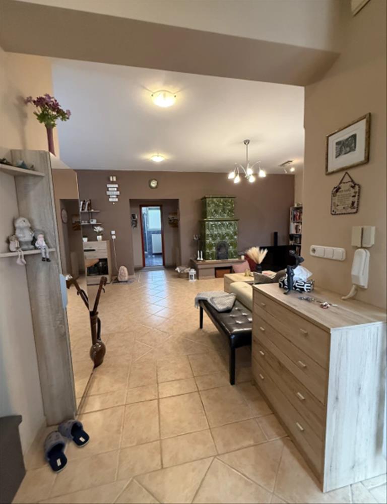 A nappali központi eleme a hangulatos, működő cserépkályha, ami nemcsak látvány, hanem valódi fűtési alternatíva is.