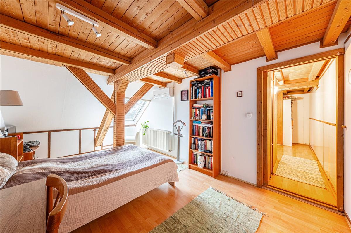 A fa gerendák, a ferde síkok és a természetes anyagok együttese karakteres, mégis letisztult hangulatot teremt. Az ablakok udvarra és utcára is néznek, így a terek világosak és körbenapozottak.