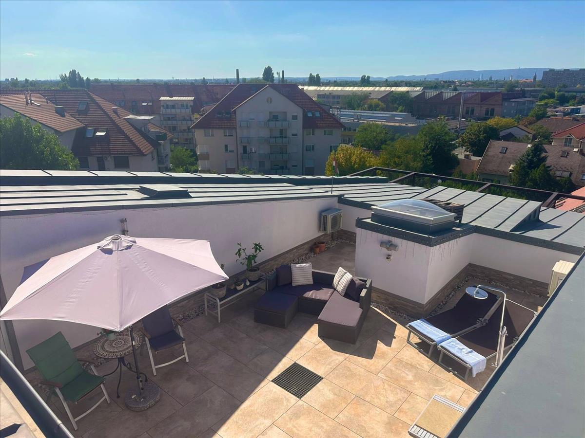 A XVIII. kerület Liptáktelep városrészében, igényes társasház legfelső emeletén, újszerű állapotú, 79 m2 lakóterületű, 2+2 félszobás Penthouse jellegű lakás, 53 m2 tetőterasszal, autóbeállóval, 2 ajándék tárolóval eladó.