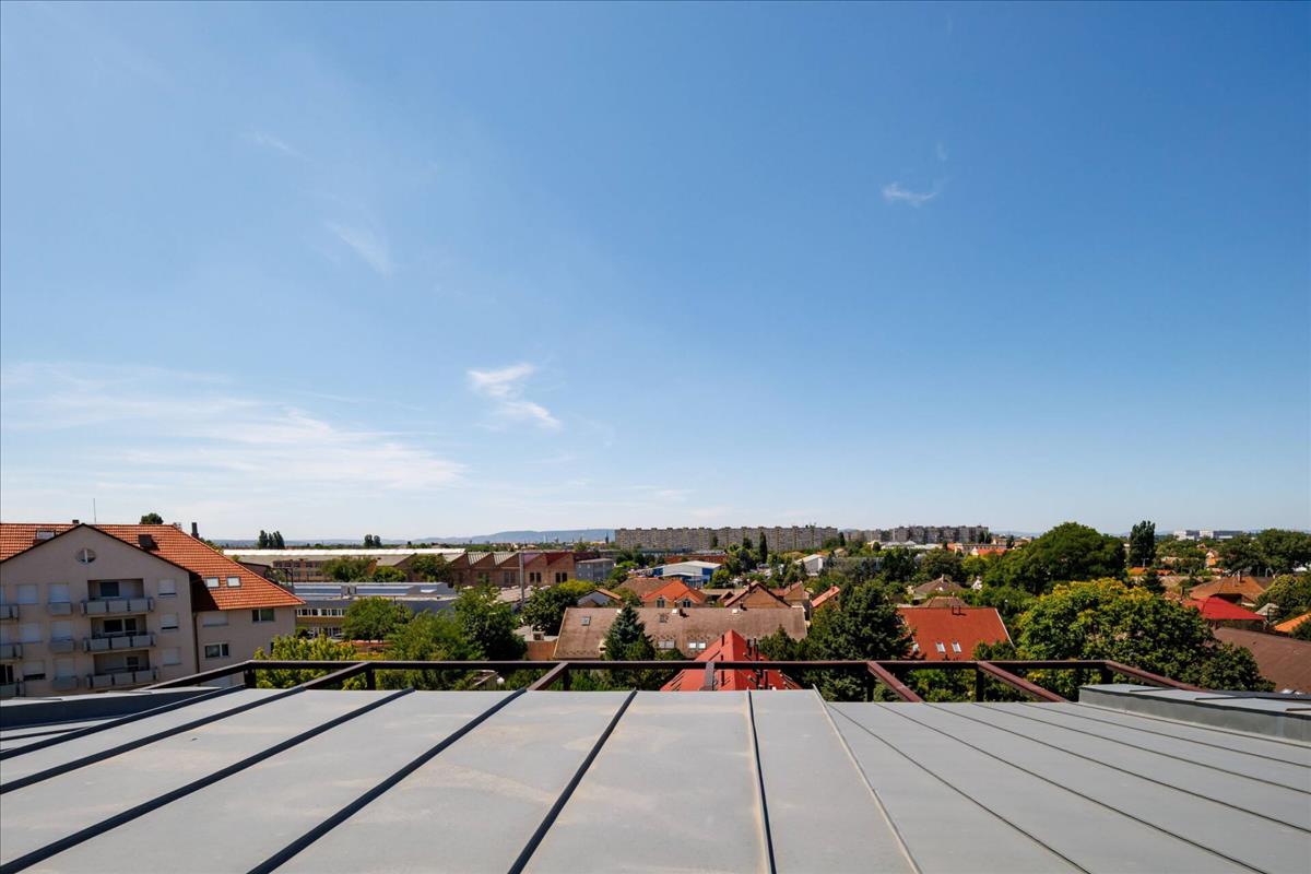 A valódi különlegességet azonban a 53 m²-es, fantasztikus tetőterasz jelenti, ahonnan lélegzetelállító panoráma nyílik a környékre. a teraszon hideg–meleg vizes zuhanyzó került kialakításra, így a nyári napokon akár saját napozóteraszként vagy kültéri wellnessként is funkcionálhat. Két külön bejáratú, egyenként 9 m²-es saját tároló is közvetlenül innen nyílik, ami tovább növeli a praktikumot.