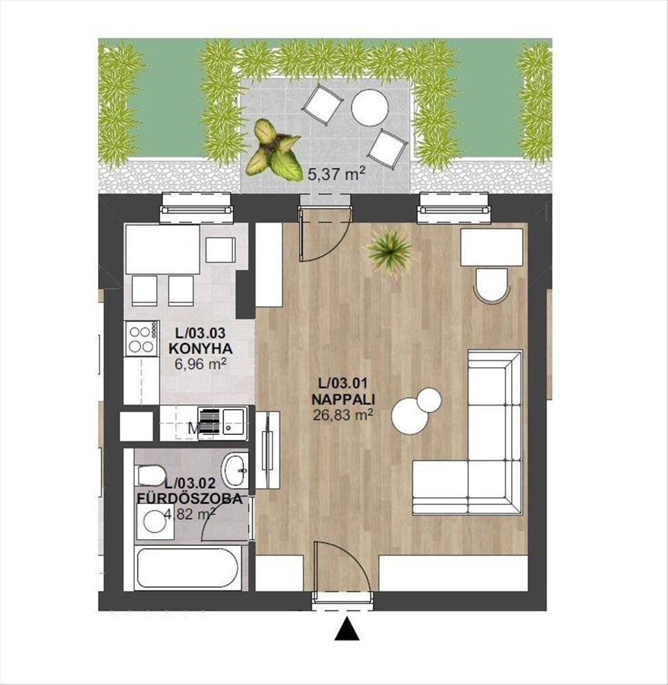 Hirdetésben szereplő stúdió lakás 38, 61 nm alapterületű, melyhez 5, 37 nm terasz tartozik, 1. emeleten található és déli tájolású. Részletes helyiség lista és elrendezése az alaprajzon megtekinthető.
