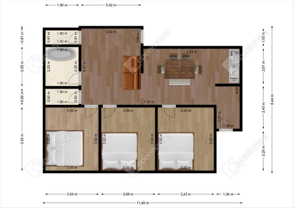 A lakás belső tere minden igényt kielégít: a hatalmas amerikai konyhás nappali a központi élettér, ahol a család és a barátok is kényelmesen összegyűlhetnek. a nappali mellett három külön nyíló hálószoba biztosítja a privát szférát, így ideális megoldás nagyobb családnak, otthoni irodát keresőknek vagy akár vendégszobának is.