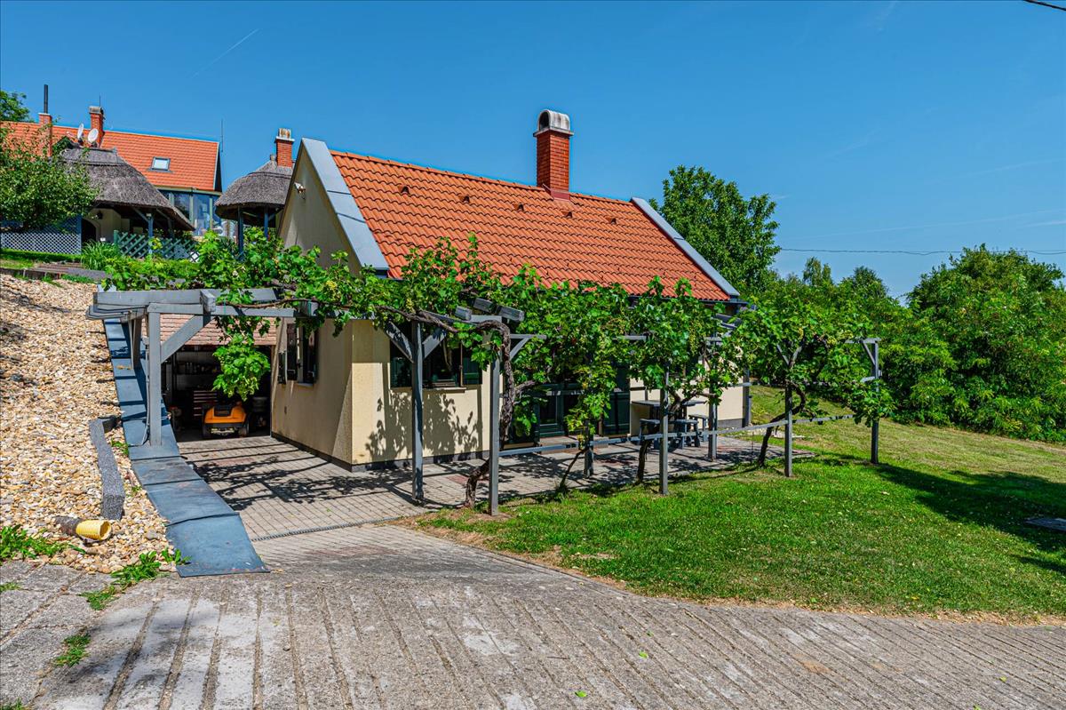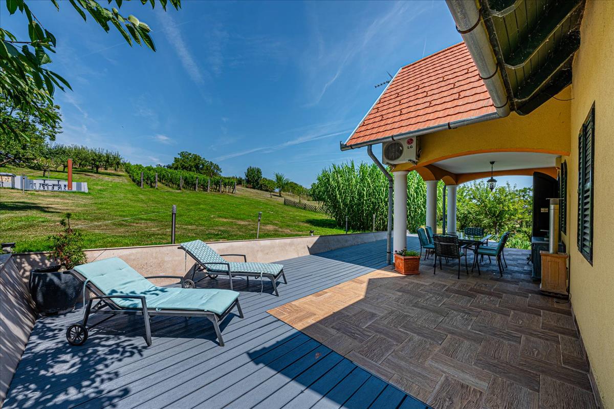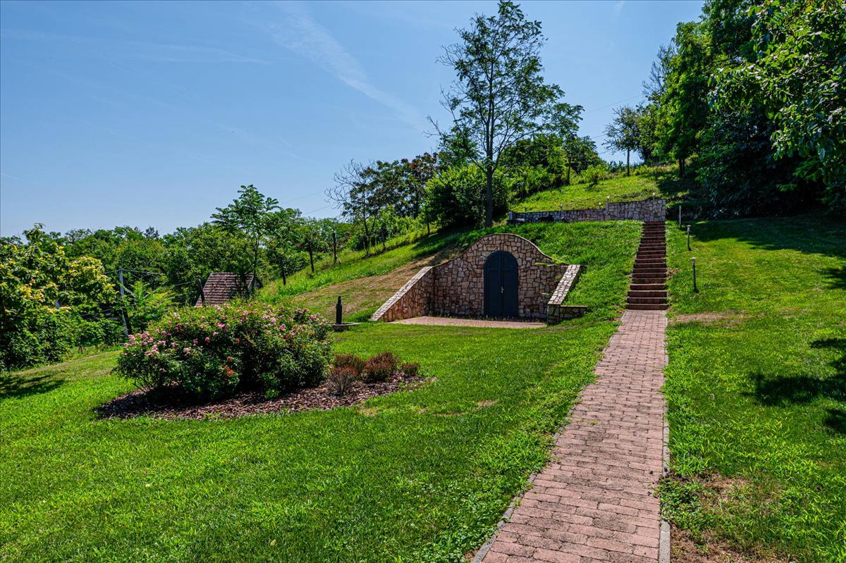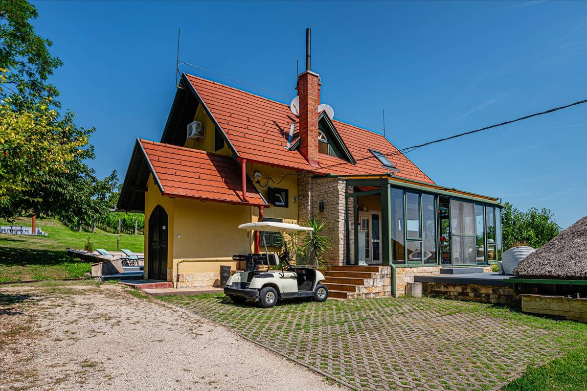 Az 1999-ben, kiváló minőségben épült ház, folyamatos karbantartás alatt állt, így megőrizte eredeti szépségét és hangulatát. a földszinten egy amerikai-konyhás nappali, egy fürdőszoba, illetve egy tágas télikert található, amely tökéletes helyet biztosít a családi összejövetelekhez és baráti találkozókhoz. a hűvös alagsor háztartási helyiséget és tárolót kínál, az emeleten pedig három kényelmes hálószoba és egy fürdőszoba található. Az épülethez tartozó nagyméretű teraszról lenyűgöző kilátás nyílik a parkosított kertre és a szőlőültetvényre, amely a természet közelségét és a nyugalmat sugározza.