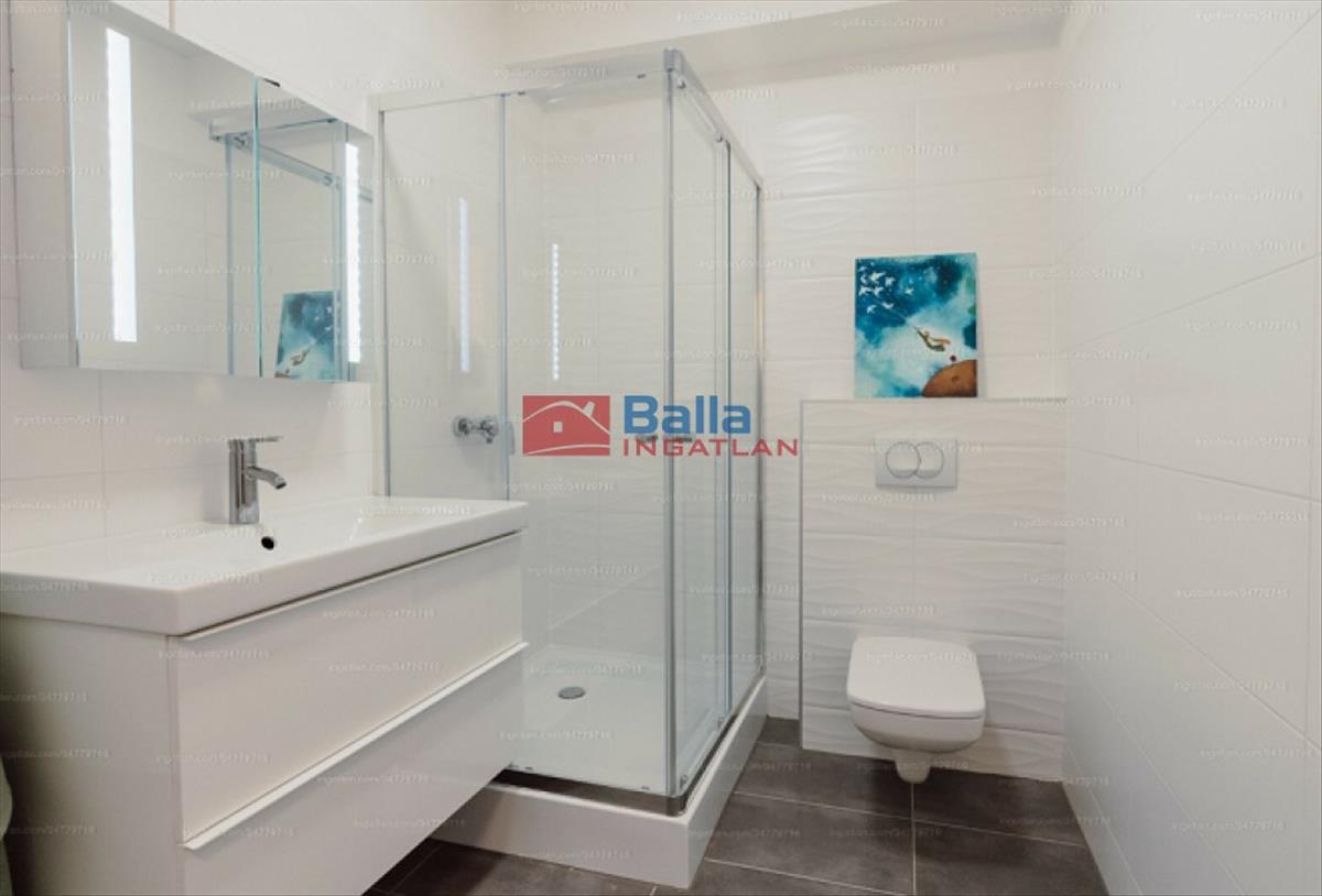 A fürdőszobában zuhanyzó, Wc, led világítással ellátott kinyitható tükrös szekrény, fiókos mosdó alatti szekrény, valamint a mosó- és szárítógép található.