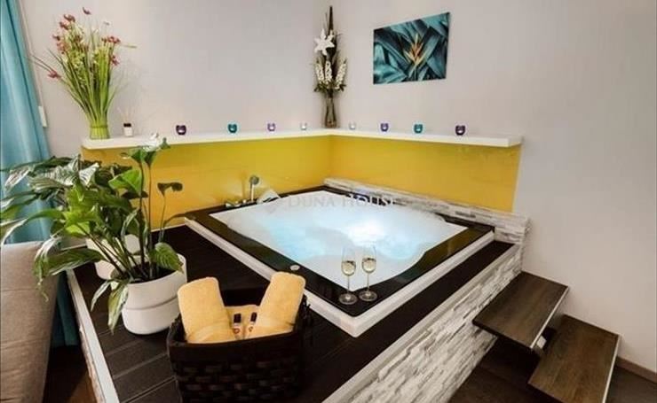 A lakás egyik különlegessége a nappaliban beépített, kétszemélyes Wellis jakuzzi, amely igazi exkluzív élményt kínál, otthoni környezetben.
