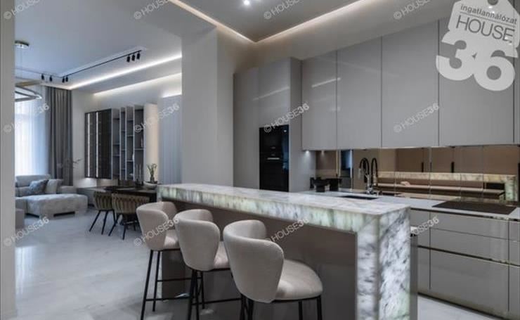 Neves tervezőiroda által megálmodott és egyedileg kivitelezett értékálló polgári lakás. Egyedileg tervezett bútorok, minőségi hidegburkolatok, led fény világítások mellett különleges Onyx kőből épitett bárpult is található.