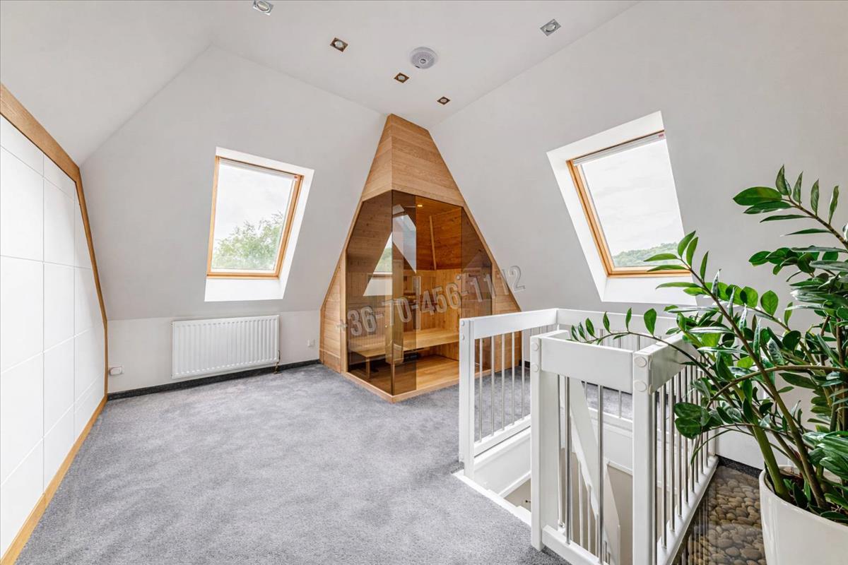 Az emeletre egy praktikus, funkcionális lépcsőn juthatunk fel, ahová egy infraszauna került beépítésre - valamennyi opcióval (sótéglák, világítás, beépített hangszóró, lábnál kiegészítő infra, illat aromák, keményfa tölgy külső burkolatok és beépített ajtóval nyitható tárolók, fa lábrács stb). Illetve itt található egy kondi terem, amerikai professzionális gépekkel felszerelve.