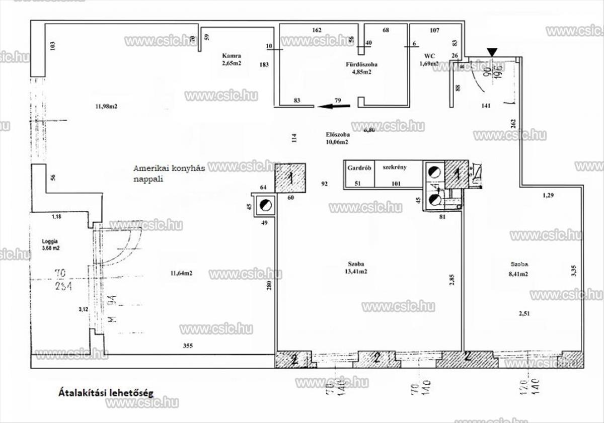 Tipp: igény esetén a konyha és a mellette lévő szoba közötti gipszkarton fal elbontható, így egy tágas amerikai konyhás nappali alakítható ki. (Lásd: 2. Alaprajz).