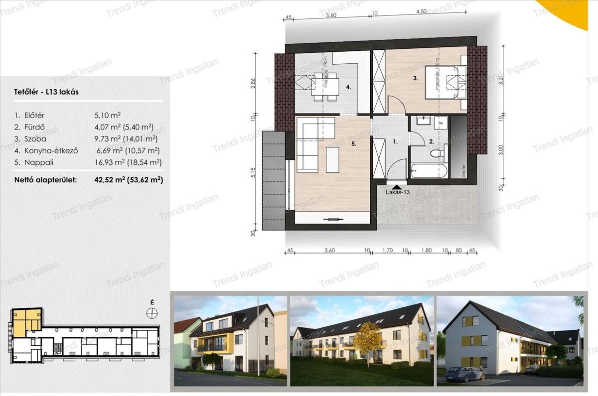 A meghirdetett tetőtérben található bruttó 53, 62 nm-es, nettó 42, 52 nm-es ingatlanban konyha, nappali, szoba, fürdőszoba, előtér kerül kialakításra.