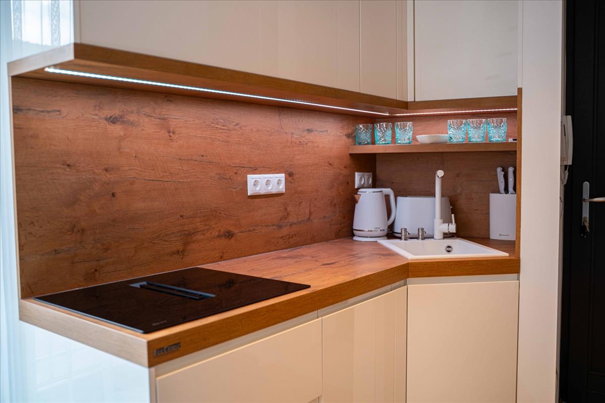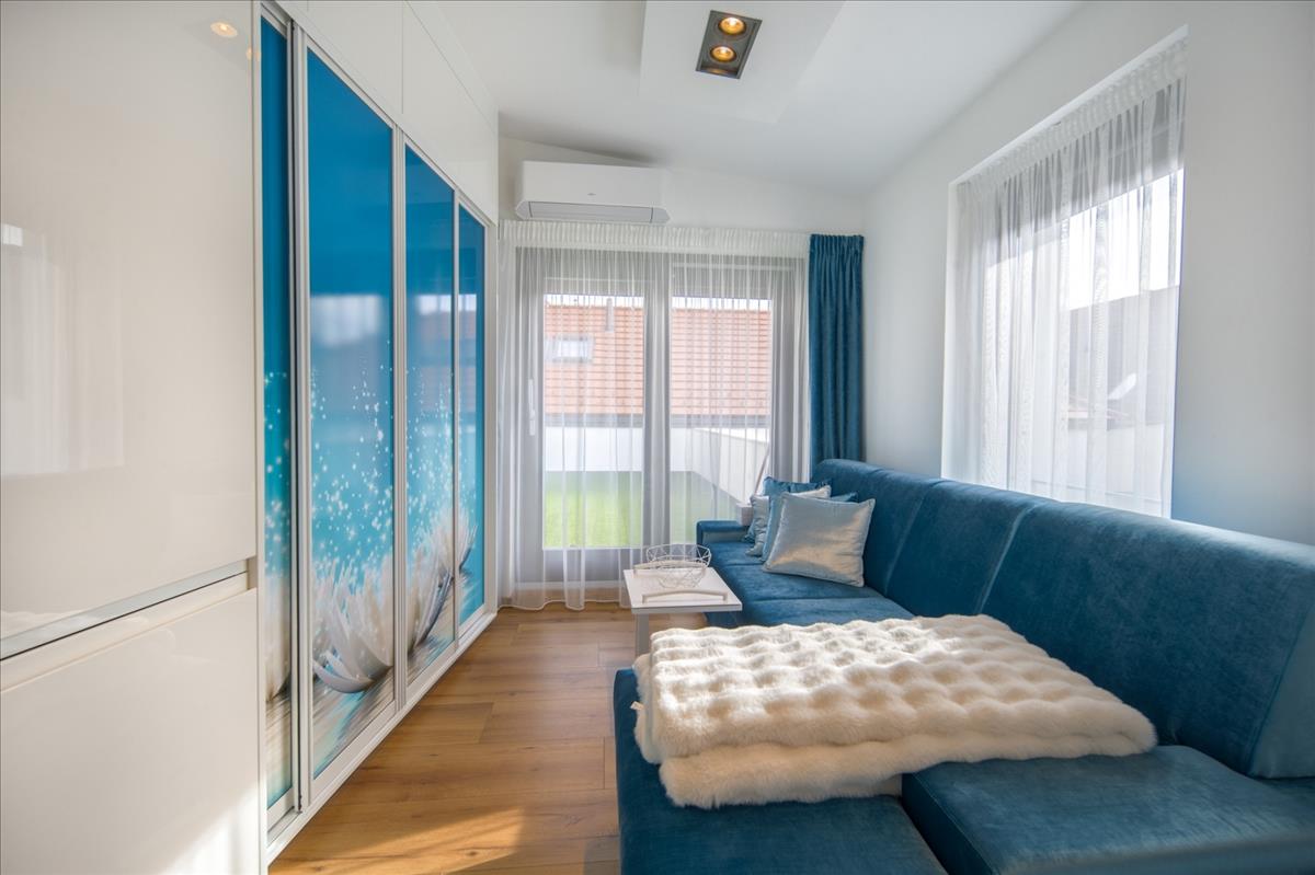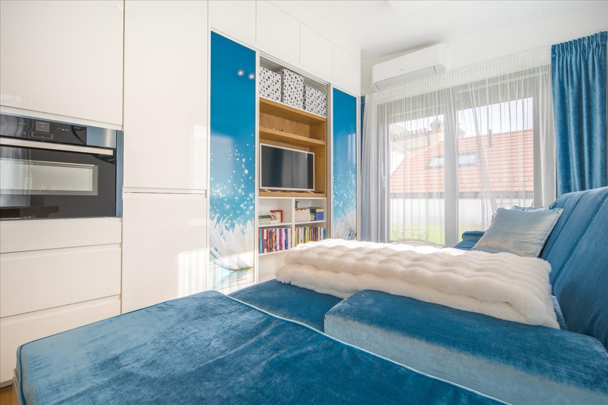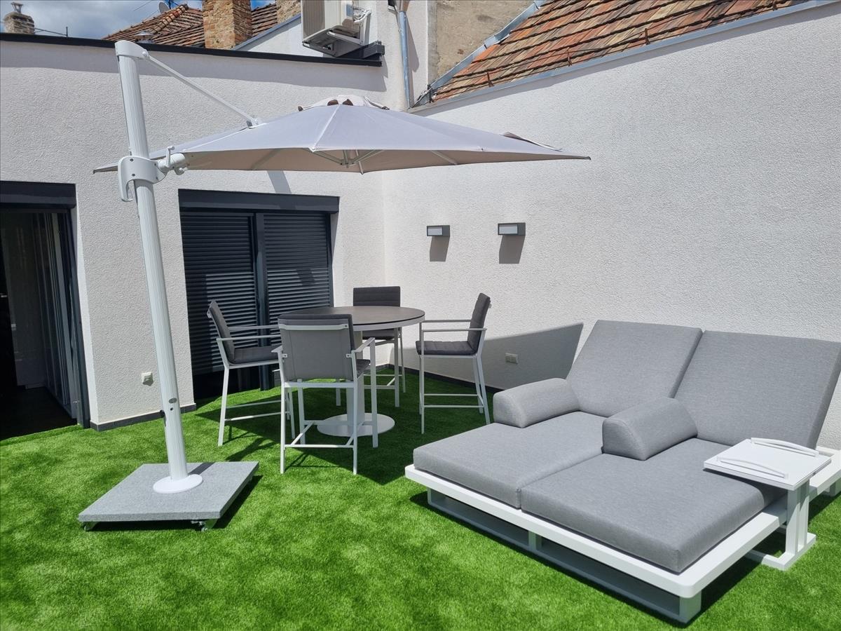 A 2 szobás ingatlan egy 30 m²-es saját terasszal, valamint fedett kocsibeállóval rendelkezik. a beépített, gépesített egyedi, magas minőpségű konyha neff gépekkel szerelt, a bútorok az ingatlan paramétereihez igazodva, egyedileg készültek, valamint a teraszbútorzat vadonatúj - mindezek az ár részét képezik.