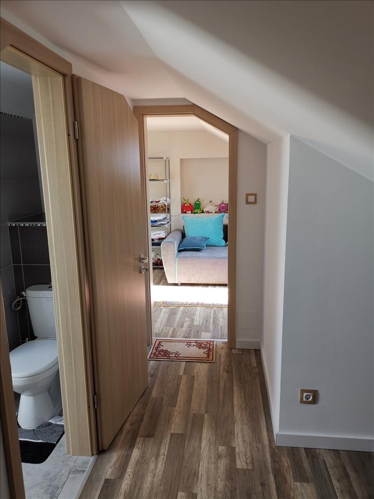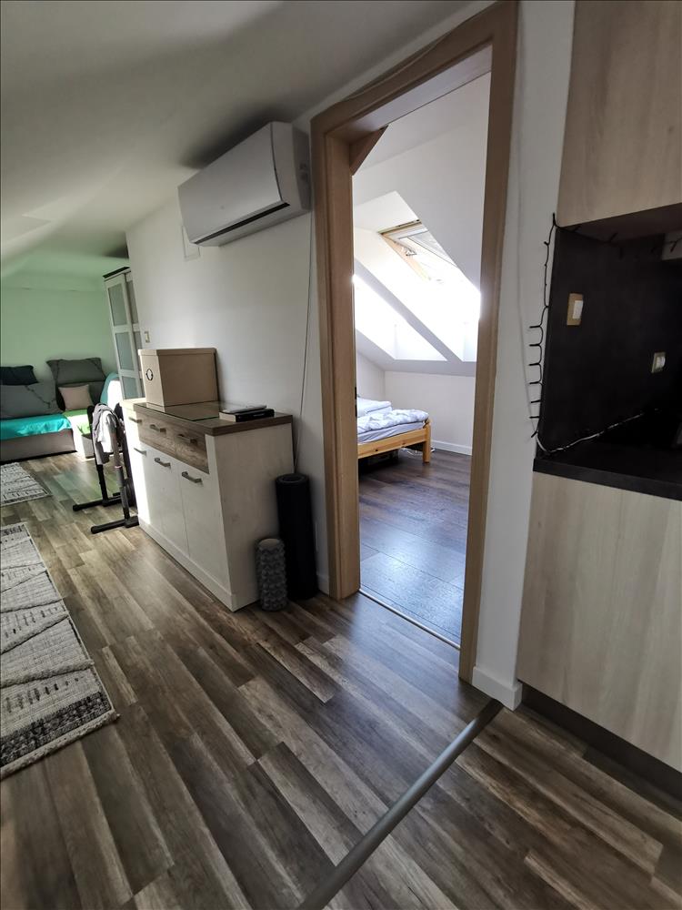 A külön bejáratú ajtó után: nappali, konyha, -étkező, kamra, szoba, fürdőszoba, valamint egy 6nm erkély.