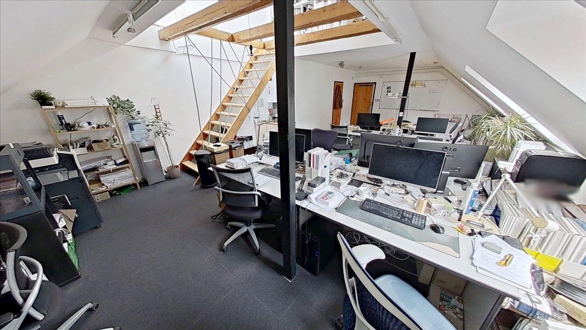 Az előtérből a lépcsőn felfelé indulva találjuk a fenti, nagyobb lakrészt, ahova belépve egy hatalmas, egy légterű, jelenleg irodaként működő helyiségben találjuk magunkat. Ebben a légtérben a tetőtérbe vezető lépcső alatt lett kialakítva egy praktikus kis konyharész. Ebből a légtérből nyílik a fürdő/wc is. Egy szépen kivitelezett fa lépcsőn tudunk a tetőtérbe feljutni, mely akár egy elszeparált külön egység (iroda, háló) is lehet. Ez a felső lakrész is lehetőséget kínál egy önálló lakás kialakítására, a nagy légterű irodarészt akár több szobává is át lehet alakítani.