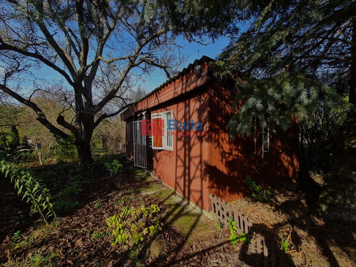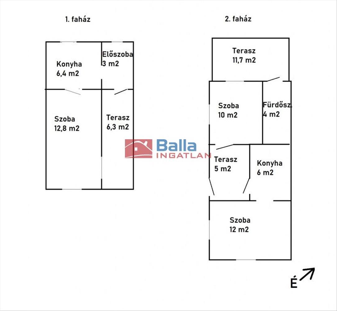 Két könnyűszerkezetes épület áll a telken. Az egyik 36 m2-es, két szobával, konyhával és egy fürdőszobával rendelkezik. a másik faház 29 m2-es, egyszobás, konyhával és előszobával rendelkezik. Mindkettőnek van egy-egy kis terasza is.