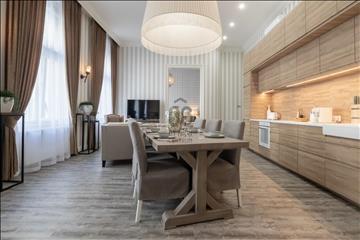 В VI районе Будапешта с отличным транспортным сообщением и инфраструктурой, на 1-м этаже хорошо сохранившегося дома построенный в 30-х годах прошлого столетия, площадью 107 м², с видом на улицу Eötvös, сдается в аренду роскошная квартира с гостиной и кухней открытого типа, 3 спальнями и 2 ванными комнатами, созданная по дизайну известной международной студии VarroDesign.