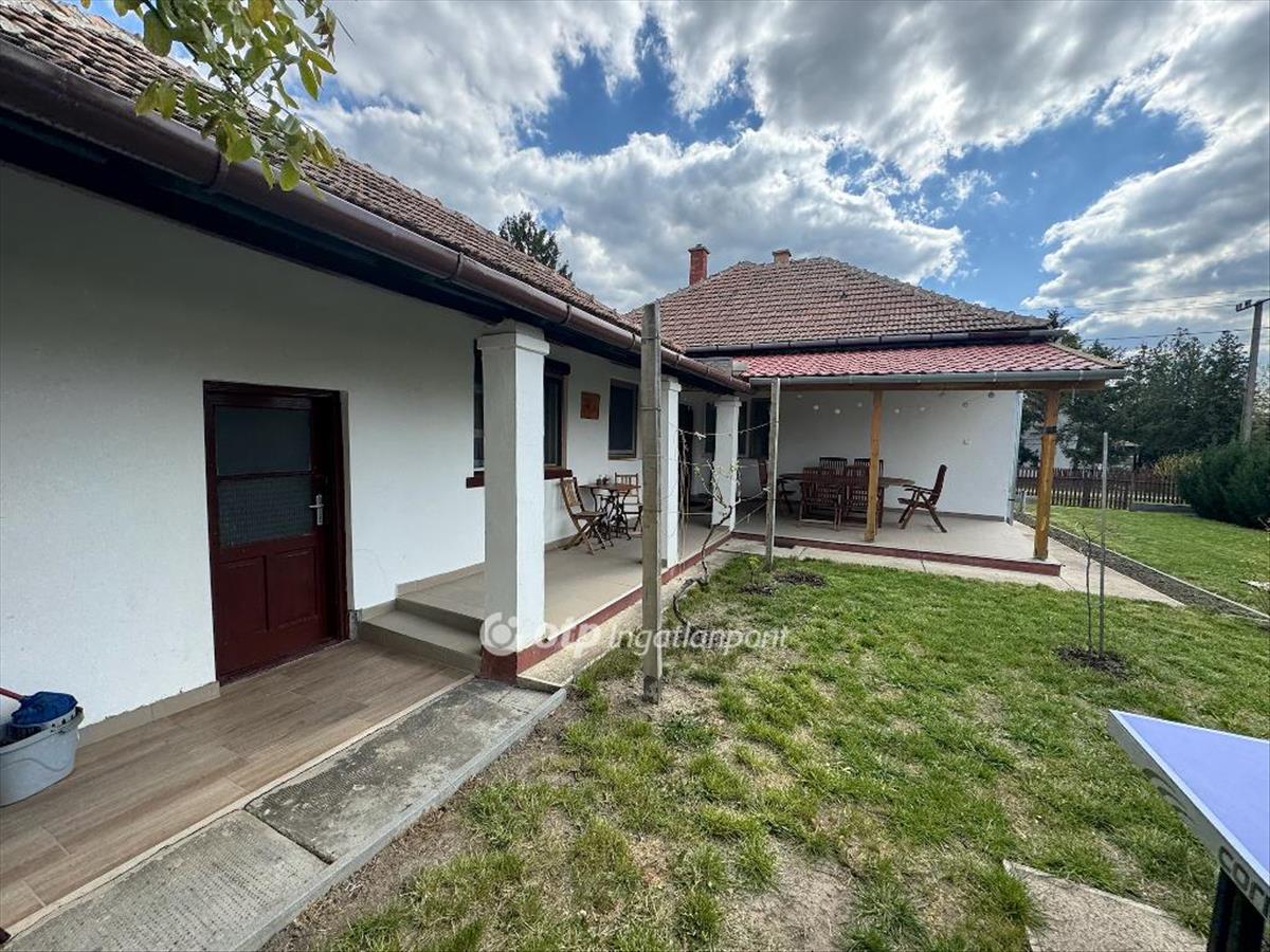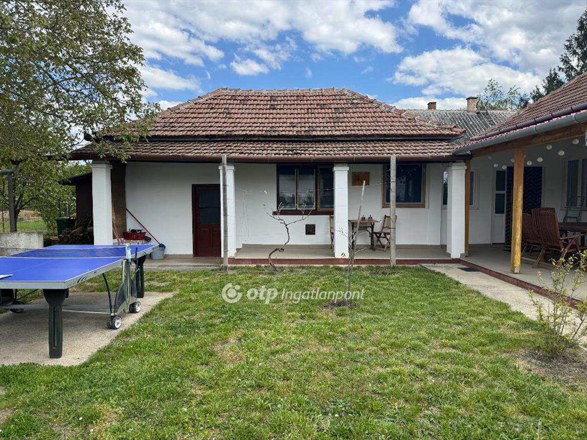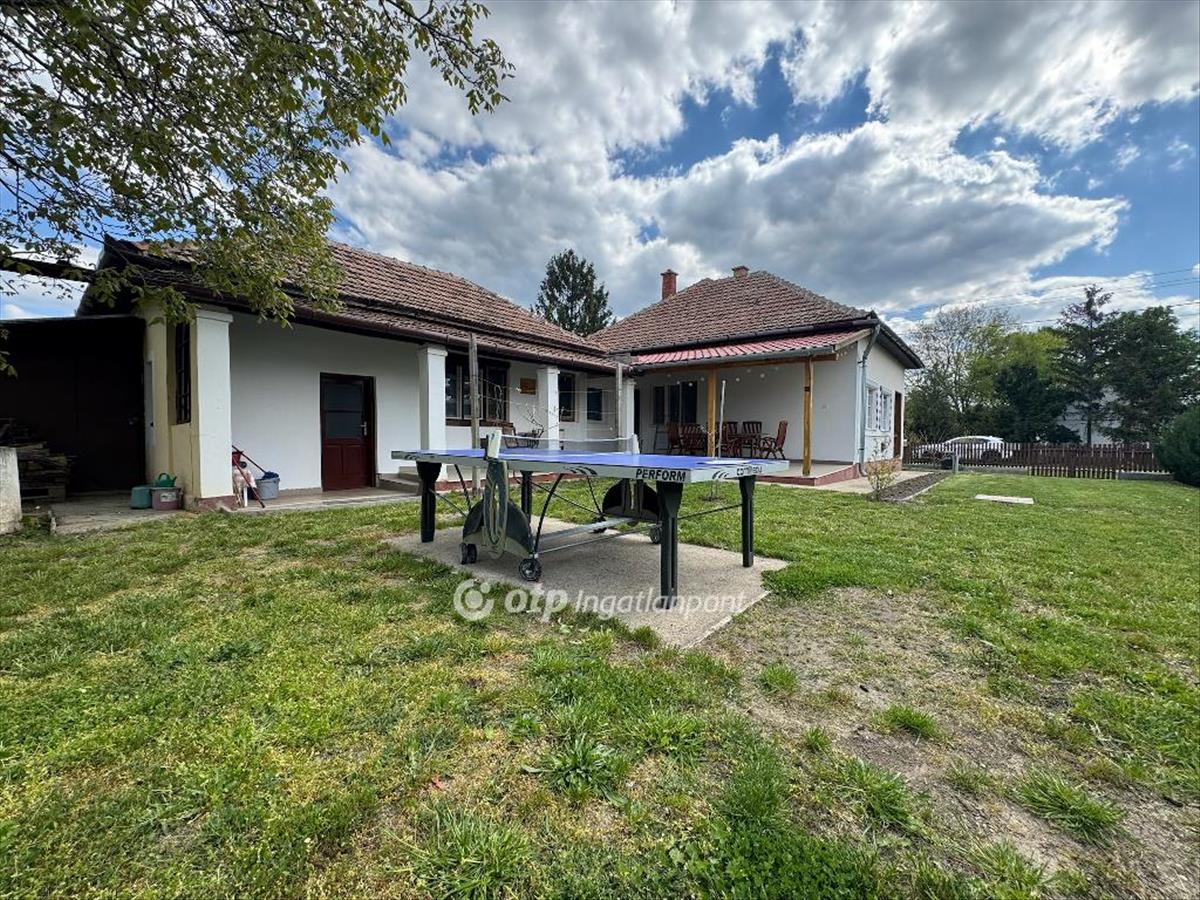 Udvara rendezett, körbekerített, rajta kerti csap, bográcsozó, pingpong asztal.