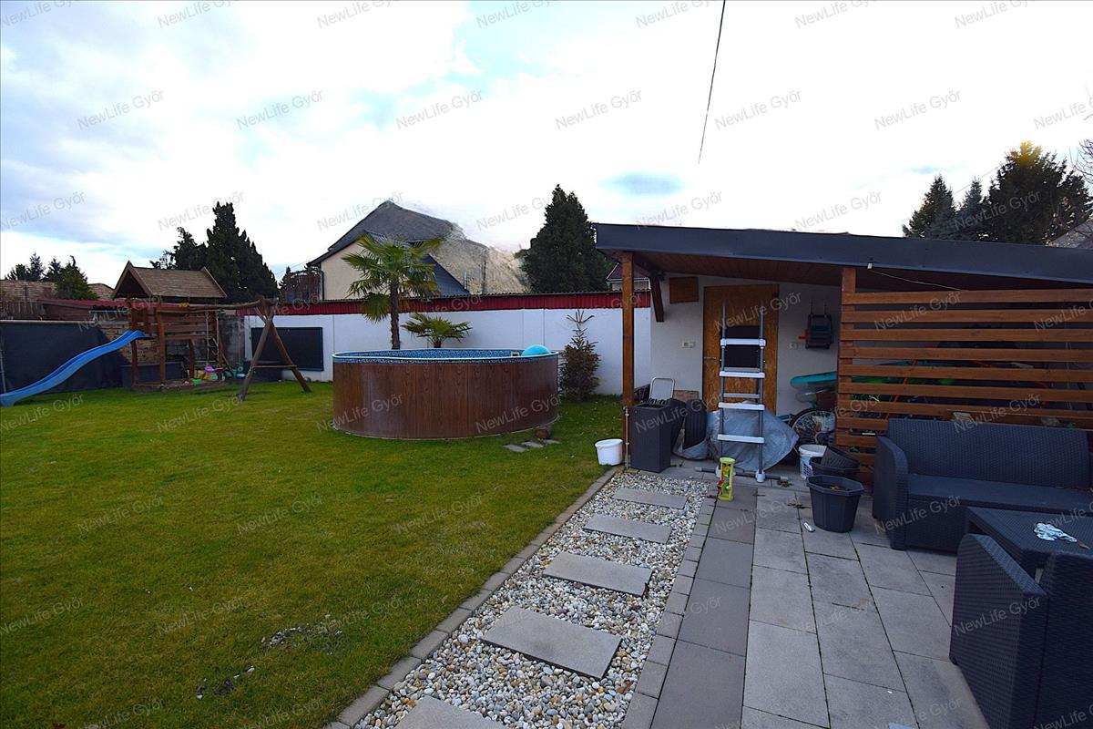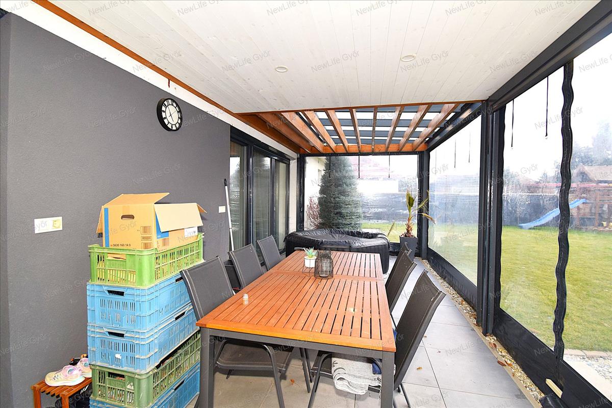 Az udvarban felépült még egy 20 m2-es tároló. Az utcáról nem látni a hátsó udvarba, illetve a terasz is teljesen privát maradt. a félig fixen fedett, félig pergolás megoldással borított, elektromos árnyékolóval szerelt terasz greslappal burkolt, vizes blokk és kinti főzésre is alkalmas pultrész áll rendelkezésre. Télen átlátszó ponyva is leengedhető a csapadék kizárására.