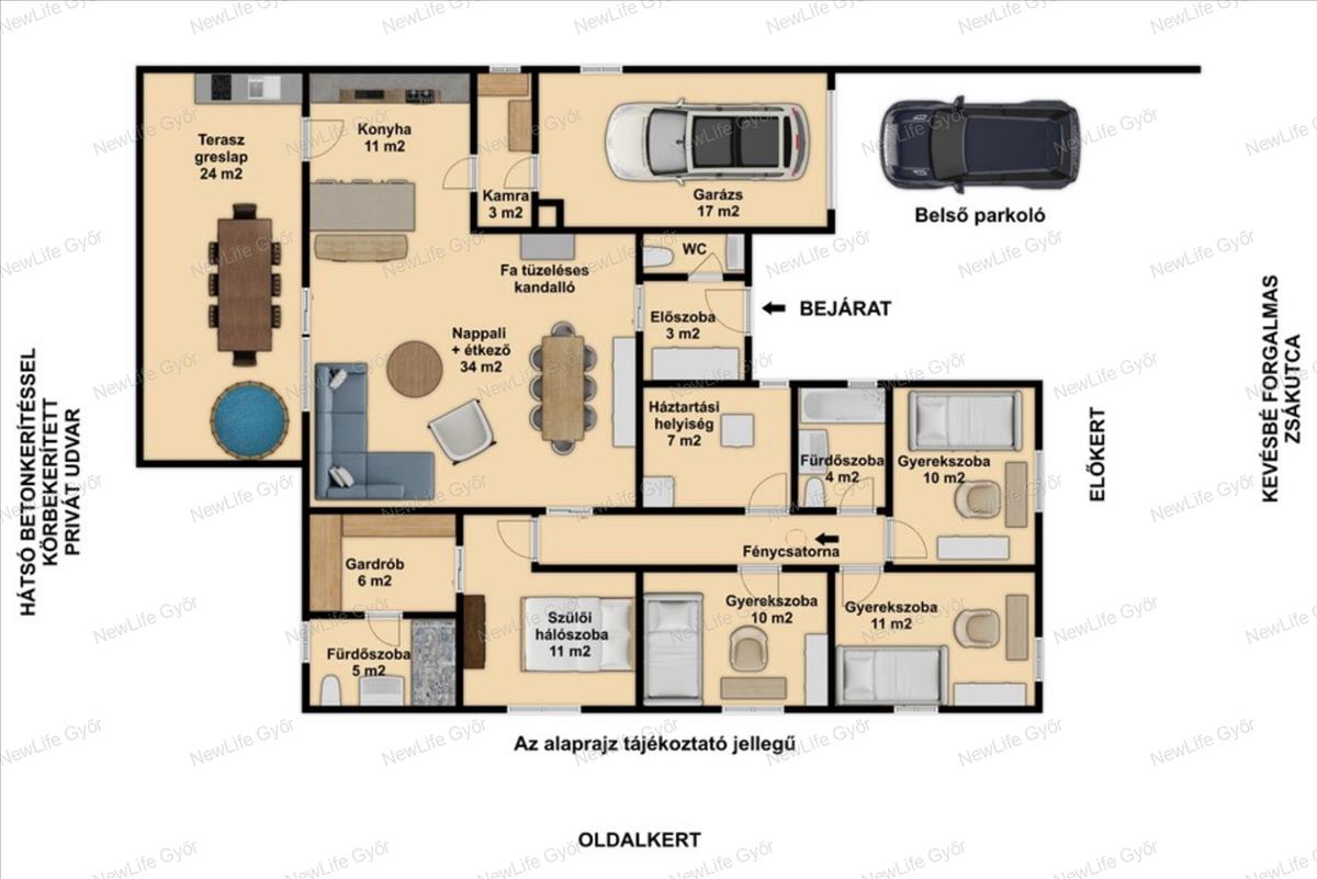 - szülői szárny: hálószoba gardróbszoba kapcsolattal, privát zuhanyzós WC-s fürdőszobával, - háztartási helység, előszoba, vendég wc kézmosóval, garázs