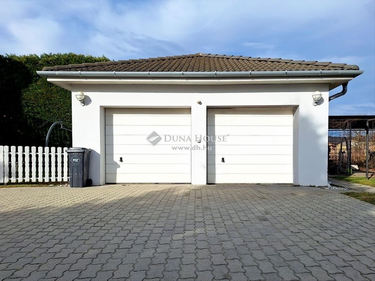 A ház mögött szinté tégla építésű, cseréptetős, dupla beállós garázs várja az autók szerelmeseit, mely helyiség szereléshez és tároláshoz is ideális helyszínt biztosít. Előtte nagyméretű térköves terület található, mely további gépkocsiknak is zárt udvaron belüli parkolást biztosít. Az Udvar gondos kezek által füvesített, sövénnyel, kúszónövényekkel, örökzöldekkel beültetett, maximálisan biztosítja a privát szférát. Az utca csendes, kizárólag új házak találhatóak benne, ahol az itt lakók időnként remek programokat szerveznek maguknak.