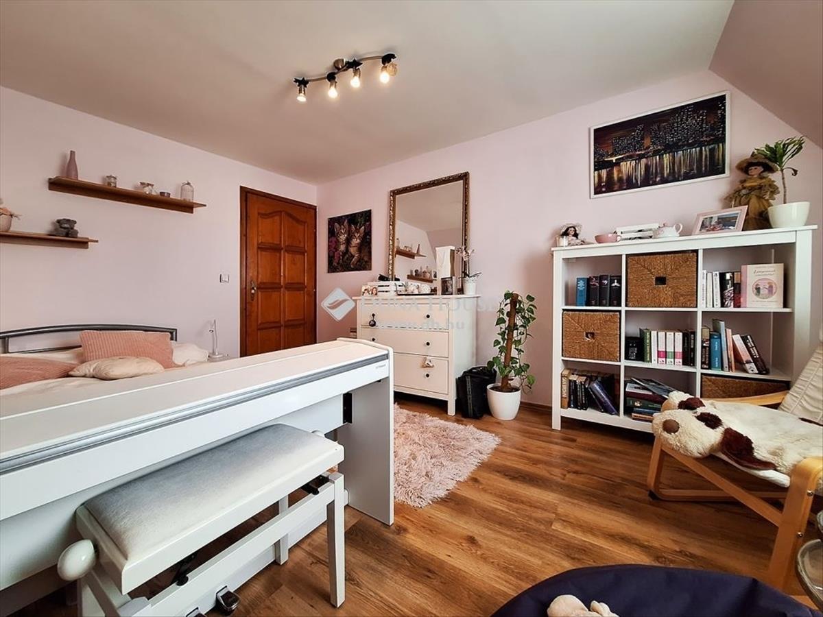 Az emeleti szobák a magas parapetnek köszönhetően, maximálisan használják ki a teret, szekrénynek, ágynak, íróasztalnak helyet biztosítva. Az egyik szobában teakonyha is rendelkezésre áll, mely akár bárpulttá is átalakítható. a hatalmas gardrób a hölgyek birodalma, egy egész szobányi terület áll a ruhák és cipők rendelkezésére. a terek az egész házban tágasak, jól kihasználhatóak, többféle funkció betöltésére alkalmasak, igény szerint variálhatóak. Az emeleten nagyméretű erkélyről szemlélhetjük a gyönyörű kilátás, kényelmes helyet biztosítva az esti szabadtéri beszélgetésekhez.
